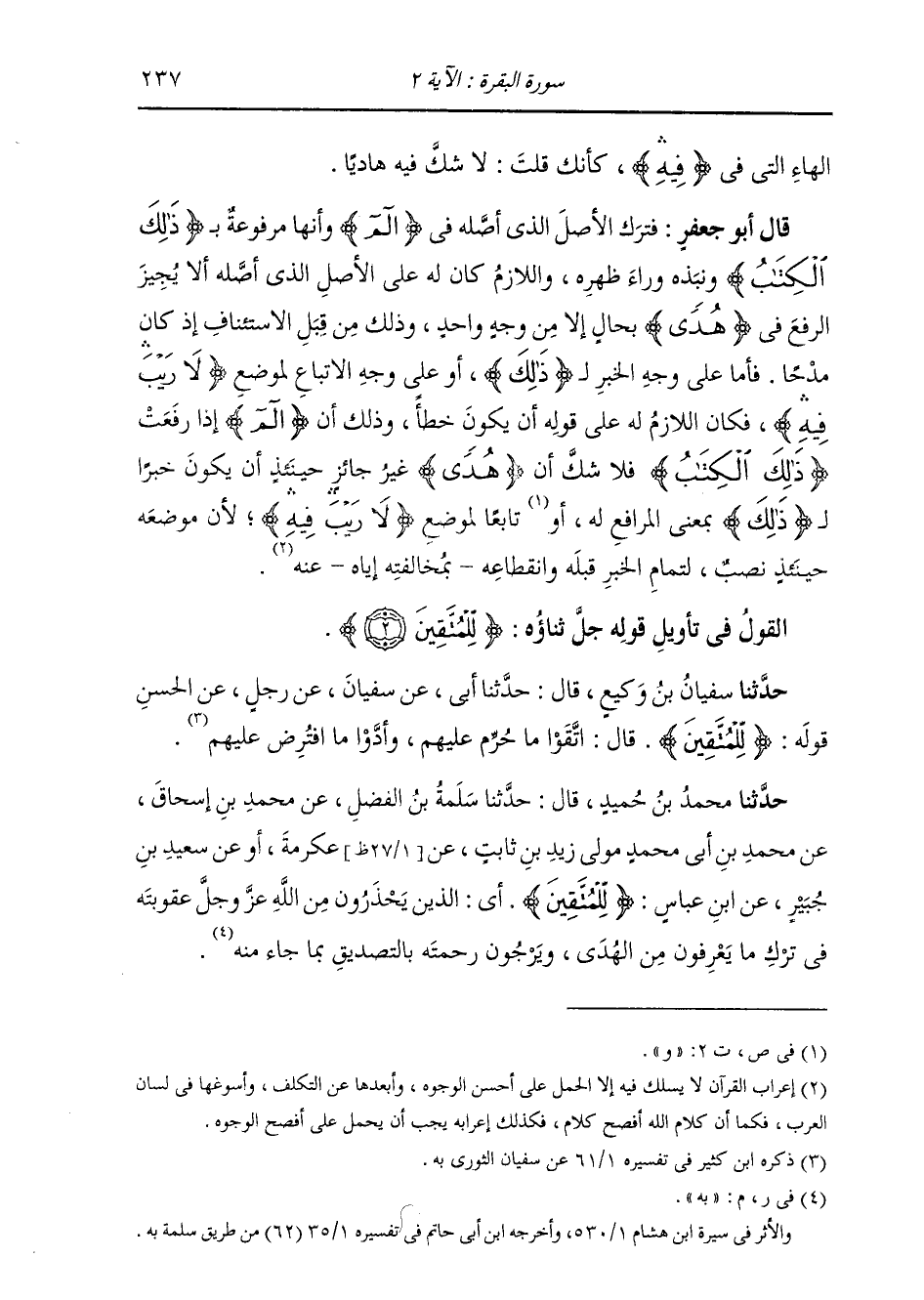 الْهَاءِ الَّتِي فِي فِيهِ كَأَنَّكَ قُلْتَ: لَا شَكَّ فِيهِ هَادِيًا. قَالَ أَبُوجَعْفَرٍ: فَتَرْكُ الْأَصْلِ الَّذِي أَصَّلَهُ فِي الم وَأَنَّهَا مَرْفُوعَةٌ بِ {ذَلِكَ الْكِتَابُ} [البقرة: 2] وَنَبْذُهُ وَرَاءَ ظَهْرِهِ. وَاللَّازِمُ لَهُ عَلَى الْأَصْلِ الَّذِي كَانَ أَصْلُهُ أَنْ لَا يُجِيزَ الرَّفْعَ فِي هُدًى بِحَالٍ إِلَّا مِنْ وَجْهٍ وَاحِدٍ، وَذَلِكَ مِنْ قِبَلِ الِاسْتِئْنَافِ إِذْ كَانَ مَدْحًا. فَأَمَّا عَلَى وَجْهِ الْخَبَرِ لِذَلِكَ، أَوْ عَلَى وَجْهِ الْإِتْبَاعِ لِمَوْضِعِ {لَا رَيْبَ فِيهِ} [البقرة: 2] فَكَانَ اللَّازِمُ لَهُ عَلَى قَوْلِهِ أَنْ يَكُونَ خَطَأً، وَذَلِكَ أَنَّ الم إِذَا رَفَعَتْ {ذَلِكَ الْكِتَابُ} [البقرة: 2] فَلَا شَكَّ أَنَّ هُدًى غَيْرُ جَائِزٍ حِينَئِذٍ أَنْ يَكُونَ خَبَرًا لِذَلِكَ بِمَعْنَى الرَّافِعِ لَهُ، أَوْ تَابِعًا لِمَوْضِعِ لَا رَيْبَ فِيهِ، لِأَنَّ مَوْضِعَهُ حِينَئِذٍ نَصْبٌ لِتَمَامِ الْخَبَرِ قَبْلَهُ وَانْقِطَاعِهِ بِمُخَالَفَتِهِ إِيَّاهُ عَنْهُ