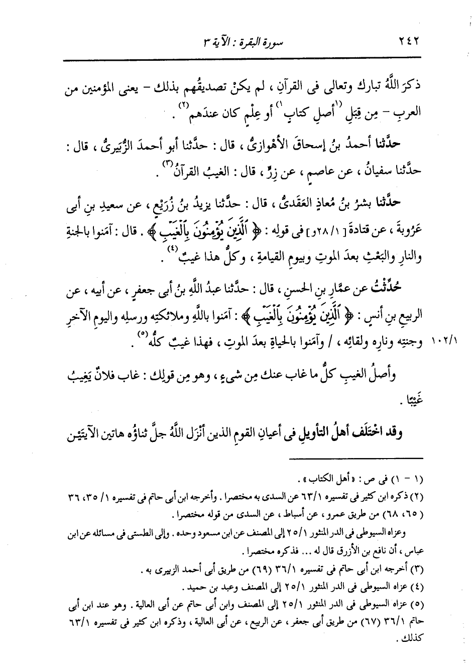 حُدِّثْتُ عَنْ عَمَّارِ بْنِ الْحَسَنِ، قَالَ: حَدَّثَنَا عَبْدُ اللَّهِ بْنُ أَبِي جَعْفَرٍ، عَنْ أَبِيهِ، عَنِ الرَّبِيعِ بْنِ أَنَسٍ: " {§الَّذِينَ يُؤْمِنُونَ بِالْغَيْبِ} [البقرة: 3] آمَنُوا بِاللَّهِ وَمَلَائِكَتِهِ وَرُسُلِهِ وَالْيَوْمِ الْآخِرِ وَجَنَّتِهِ وَنَارِهِ وَلِقَائِهِ، وَآمَنُوا بِالْحَيَاةِ بَعْدَ الْمَوْتِ، فَهَذَا كُلُّهُ غَيْبٌ وَأَصْلُ الْغَيْبِ: كُلُّ مَا غَابَ عَنْكَ مِنْ شَيْءٍ، وَهُوَ مِنْ قَوْلِكَ: غَابَ فُلَانٌ يَغِيبُ غَيْبًا " وَقَدِ اخْتَلَفَ أَهْلُ التَّأْوِيلِ فِي أَعْيَانِ الْقَوْمِ الَّذِينَ أَنْزَلَ اللَّهُ جَلَّ ثَنَاؤُهُ هَاتَيْنِ الْآيَتَيْنِ