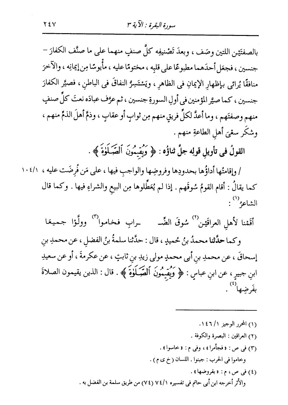 §الْقَوْلُ فِي تَأْوِيلِ قَوْلِهِ تَعَالَى: {وَيُقِيمُونَ} [البقرة: 3] إِقَامَتُهَا: أَدَاؤُهَا بِحُدُودِهَا وَفُرُوضِهَا وَالْوَاجِبِ فِيهَا عَلَى مَا فُرِضَتْ عَلَيْهِ، كَمَا يُقَالُ: أَقَامَ الْقَوْمُ سُوقَهُمْ، إِذَا لَمْ يُعَطِّلُوهَا مِنَ الْبَيْعِ وَالشِّرَاءِ فِيهَا، وَكَمَا قَالَ الشَّاعِرُ: