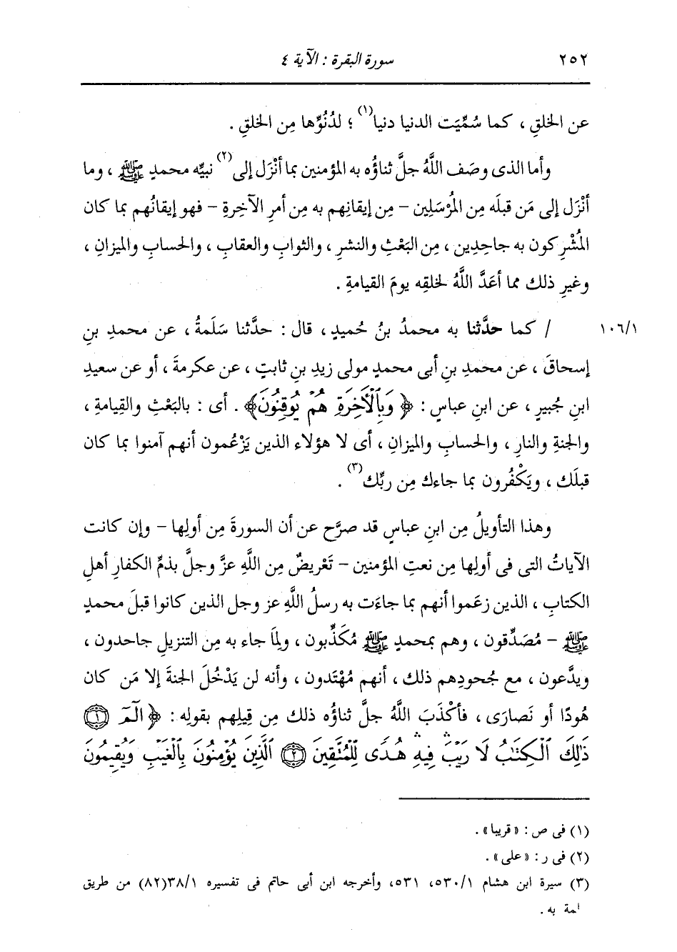 كَمَا حَدَّثَنَا بِهِ، مُحَمَّدُ بْنُ حُمَيْدٍ، قَالَ: حَدَّثَنَا سَلَمَةُ، عَنْ مُحَمَّدِ بْنِ إِسْحَاقَ، عَنْ مُحَمَّدِ بْنِ أَبِي مُحَمَّدٍ، مَوْلَى زَيْدِ بْنِ ثَابِتٍ، عَنْ عِكْرِمَةَ أَوْ عَنْ سَعِيدِ بْنِ جُبَيْرٍ، عَنِ ابْنِ عَبَّاسٍ: " {§وَبِالْآخِرَةِ هُمْ يُوقِنُونَ} [البقرة: 4] أَيْ بِالْبَعْثِ وَالْقِيَامَةِ وَالْجَنَّةِ وَالنَّارِ وَالْحِسَابِ وَالْمِيزَانِ، أَيْ لَا هَؤُلَاءِ الَّذِينَ يَزْعُمُونَ أَنَّهُمْ آمَنُوا بِمَا كَانَ قَبْلَكَ وَيَكْفُرُونَ بِمَا جَاءَكَ مِنْ رَبِّكَ " وَهَذَا التَّأْوِيلُ مِنِ ابْنِ عَبَّاسٍ قَدْ صَرَّحَ عَنْ أَنَّ السُّورَةَ مِنْ أَوَّلِهَا وَإِنْ كَانَتِ الْآيَاتُ الَّتِي فِي أَوَّلِهَا مِنْ نَعْتِ الْمُؤْمِنِينَ تَعْرِيضٌ مِنَ اللَّهِ عَزَّ وَجَلَّ بِذَمِّ الْكُفَّارِ أَهْلَ الْكِتَابِ الَّذِينَ زَعَمُوا أَنَّهُمْ بِمَا جَاءَتْ بِهِ رُسُلُ اللَّهِ عَزَّ وَجَلَّ الَّذِينَ كَانُوا قَبْلَ مُحَمَّدٍ صَلَوَاتُ اللَّهُ عَلَيْهِمْ وَعَلَيْهِ مُصَدِّقُونَ وَهُمْ بِمُحَمَّدٍ عَلَيْهِ الصَّلَاةُ وَالسَّلَامُ مُكَذِّبُونَ، وَلِمَا جَاءَ بِهِ مِنَ التَّنْزِيلِ جَاحِدُونَ، وَيَدَّعُونَ مَعَ جُحُودِهِمْ ذَلِكَ أَنَّهُمْ مُهْتَدُونَ وَأَنَّهُ لَنْ يَدْخُلَ الْجَنَّةَ إِلَّا مَنْ كَانَ هُودًا أَوْ نَصَارَى فَأَكْذَبَ اللَّهُ جَلَّ ثَنَاؤُهُ ذَلِكَ مِنْ قِيلِهِمْ بِقَوْلِهِ: {الم ذَلِكَ الْكِتَابُ لَا رَيْبَ فِيهِ هُدًى لِلْمُتَّقِينَ الَّذِينَ يُؤْمِنُونَ بِالْغَيْبِ وَيُقِيمُونَ -[253]- الصَّلَاةَ وَمِمَّا رَزَقْنَاهُمْ يُنْفِقُونَ وَالَّذِينَ يُؤْمِنُونَ بِمَا أَنْزَلَ إِلَيْكَ وَمَا أَنْزَلَ مِنْ قَبْلِكَ وَبِالْآخِرَةِ هُمْ يُوقِنُونَ} [البقرة: 2] وَأَخْبَرَ جَلَّ ثَنَاؤُهُ عِبَادَهُ أَنَّ هَذَا الْكِتَابَ هُدًى لِأَهْلِ الْإِيمَانِ بِمُحَمَّدٍ صَلَّى اللهُ عَلَيْهِ وَسَلَّمَ، وَبِمَا جَاءَ بِهِ الْمُصَدِّقِينَ بِمَا أُنْزِلَ إِلَيْهِ وَإِلَى مَنْ قَبْلَهُ مِنْ رُسُلِهِ مِنَ الْبَيِّنَاتِ وَالْهُدَى خَاصَّةً، دُونَ مَنْ كَذَّبَ بِمُحَمَّدٍ صَلَّى اللهُ عَلَيْهِ وَسَلَّمَ وَبِمَا جَاءَ بِهِ، وَادَّعَى أَنَّهُ مُصَدِّقٌ بِمَنْ قَبْلَ مُحَمَّدٍ عَلَيْهِ الصَّلَاةُ وَالسَّلَامُ مِنَ الرُّسُلِ وَبِمَا جَاءَ بِهِ مِنَ الْكُتُبِ. ثُمَّ أَكَّدَ جَلَّ ثَنَاؤُهُ أَمْرَ الْمُؤْمِنِينَ مِنَ الْعَرَبِ وَمِنْ أَهْلِ الْكِتَابِ الْمُصَدِّقِينَ بِمُحَمَّدٍ عَلَيْهِ الصَّلَاةُ وَالسَّلَامُ وَبِمَا أُنْزِلَ إِلَيْهِ وَإِلَى مَنْ قَبْلَهُ مِنَ الرُّسُلِ بِقَوْلِهِ: {أُولَئِكَ عَلَى هُدًى مِنْ رَبِّهِمْ -[254]- وَأُولَئِكَ هُمُ الْمُفْلِحُونَ} [البقرة: 5] فَأَخْبَرَ أَنَّهُمْ هُمْ أَهْلُ الْهُدَى وَالْفَلَاحِ خَاصَّةً دُونَ غَيْرِهِمْ، وَأَنَّ غَيْرَهُمْ هُمْ أَهْلُ الضَّلَالِ وَالْخَسَارِ