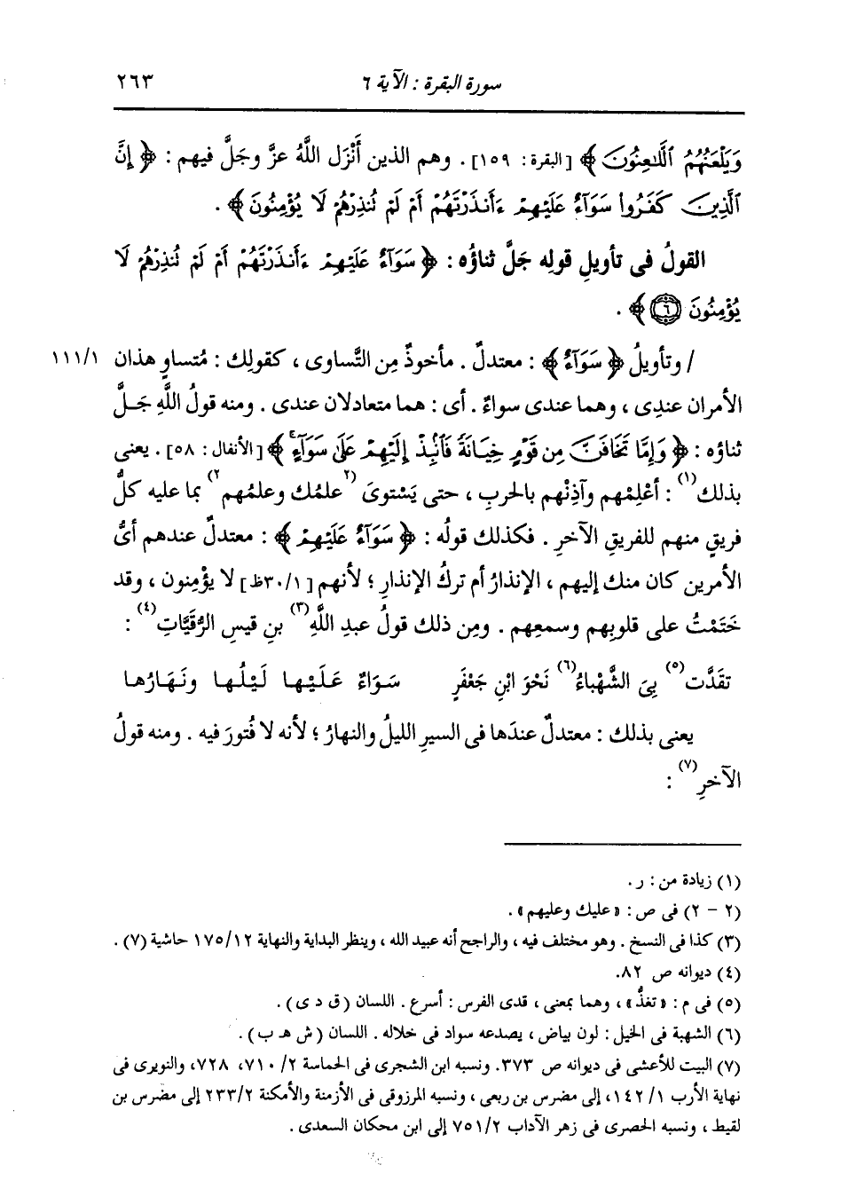 §الْقَوْلُ فِي تَأْوِيلِ قَوْلِهِ تَعَالَى: {سَوَاءٌ عَلَيْهِمْ أَأَنْذَرْتَهُمْ أَمْ لَمْ تُنْذِرْهُمْ لَا يُؤْمِنُونَ} [البقرة: 6] وَتَأْوِيلُ {سَوَاءٌ} [البقرة: 6] : مُعْتَدِلٌ، مَأْخُوذٌ مِنَ التَّسَاوِي، كَقَوْلِكَ: مُتَسَاوٍ هَذَانِ الْأَمْرَانِ عِنْدِي، وَهُمَا عِنْدِي سَوَاءٌ؛ أَيْ هُمَا مُتَعَادِلَانِ عِنْدِي. وَمِنْهُ قَوْلُ اللَّهِ جَلَّ ثَنَاؤُهُ: {فَانْبِذْ إِلَيْهِمْ عَلَى سَوَاءٍ} [الأنفال: 58] يَعْنِي أَعْلِمْهُمْ وَآذِنْهُمْ بِالْحَرْبِ حَتَّى يَسْتَوِيَ عِلْمُكَ وَعِلْمُهُمْ بِمَا عَلَيْهِ كُلُّ فَرِيقٍ مِنْهُمْ لِلْفَرِيقِ الْآخَرِ. فَكَذَلِكَ قَوْلُهُ: {سَوَاءٌ عَلَيْهِمْ} [البقرة: 6] مُعْتَدِلٌ عِنْدَهُمْ أَيُّ الْأَمْرَيْنِ كَانَ مِنْكَ إِلَيْهِمُ الْإِنْذَارُ أَمْ تَرْكُ الْإِنْذَارِ لِأَنَّهُمْ كَانُوا لَا يُؤْمِنُونَ، وَقَدْ خَتَمْتُ عَلَى قُلُوبِهِمْ وَسَمْعِهِمْ. وَمِنْ ذَلِكَ قَوْلُ عُبَيْدِ اللَّهِ بْنِ قَيْسِ الرُّقَيَّاتِ: