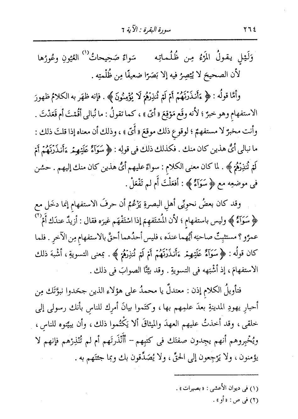 لِأَنَّ الصَّحِيحَ لَا يُبْصِرُ فِيهِ إِلَّا بَصَرًا ضَعِيفًا مِنْ ظُلْمَتِهِ. وَأَمَّا قَوْلُهُ: {أَأَنْذَرْتَهُمْ أَمْ لَمْ تُنْذِرْهُمْ لَا يُؤْمِنُونَ} [البقرة: 6] فَإِنَّهُ ظَهَرَ بِهِ الْكَلَامُ ظُهُورَ الِاسْتِفْهَامِ وَهُوَ خَبَرٌ؛ لِأَنَّهُ وَقَعَ مَوْقِعَ أَيِّ، كَمَا تَقُولُ: لَا نُبَالِي أَقُمْتَ أَمْ قَعَدْتَ، وَأَنْتَ مُخْبَرٌ لَا مُسْتَفْهِمٌ لِوُقُوعِ ذَلِكَ مَوْقِعَ أَيِّ، وَذَلِكَ أَنَّ مَعْنَاهُ إِذَا قُلْتَ ذَلِكَ: مَا نُبَالِي أَيُّ هَذَيْنِ كَانَ مِنْكَ، فَكَذَلِكَ ذَلِكَ فِي قَوْلِهِ: {سَوَاءٌ عَلَيْهِمْ أَأَنْذَرْتَهُمْ أَمْ لَمْ تُنْذِرْهُمْ} [البقرة: 6] لَمَّا كَانَ مَعْنَى الْكَلَامِ: سَوَاءٌ عَلَيْهِمْ أَيُّ هَذَيْنِ كَانَ مِنْكِ إِلَيْهِمْ، حَسُنَ فِي مَوْضِعِهِ مَعَ سَوَاءٍ: أَفَعَلْتَ أَمْ لَمْ تَفْعَلْ. وَقَدْ كَانَ بَعْضُ نَحْوِيِّي أَهْلِ الْبَصْرَةِ يَزْعُمُ أَنَّ حَرْفَ الِاسْتِفْهَامِ إِنَّمَا دَخَلَ مَعَ سَوَاءٍ وَلَيْسَ بِاسْتِفْهَامٍ، لِأَنَّ الْمُسْتَفْهِمَ إِذَا اسْتَفْهَمَ غَيْرَهُ فَقَالَ: أَزَيْدٌ عِنْدَكَ أَمْ عَمْرٌو؟ مُسْتَثْبِتٌ صَاحِبَهُ أَيُّهُمَا عِنْدَهُ، فَلَيْسَ أَحَدُهُمَا أَحَقَّ بِالِاسْتِفْهَامِ مِنَ الْآخَرِ. فَلَمَّا كَانَ قَوْلُهُ: {سَوَاءٌ عَلَيْهِمْ أَأَنْذَرْتَهُمْ أَمْ لَمْ تُنْذِرْهُمْ} [البقرة: 6] بِمَعْنَى التَّسْوِيَةِ، أَشْبَهَ ذَلِكَ الِاسْتِفْهَامَ إِذْ أَشْبَهَهُ فِي التَّسْوِيَةِ، وَقَدْ بَيَّنَّا الصَّوَابَ فِي ذَلِكَ. فَتَأْوِيلُ الْكَلَامِ إِذًا: مُعْتَدِلٌ يَا مُحَمَّدُ عَلَى هَؤُلَاءِ الَّذِينَ جَحَدُوا نُبُوَّتَكَ مِنْ أَحْبَارِ يَهُودِ الْمَدِينَةِ بَعْدَ عِلْمِهِمْ بِهَا، وَكَتَمُوا بَيَانَ أَمْرِكَ لِلنَّاسِ بِأَنَّكَ رَسُولِي إِلَى خَلْقِي، وَقَدْ أَخَذْتُ عَلَيْهِمُ الْعَهْدَ وَالْمِيثَاقَ أَنْ لَا يَكْتُمُوا ذَلِكَ وَأَنْ يُبَيِّنُوهُ لِلنَّاسِ وَيُخْبِرُوهُمْ أَنَّهُمْ يَجِدُونَ صِفَتَكَ فِي كُتُبِهِمْ؛ {أَأَنْذَرْتَهُمْ أَمْ لَمْ تُنْذِرْهُمْ} [البقرة: 6] فَإِنَّهُمْ لَا يُؤْمِنُونَ وَلَا يَرْجِعُونَ إِلَى الْحَقِّ وَلَا يُصَدِّقُونَ بِكَ وَبِمَا جِئْتَهُمْ بِهِ؛