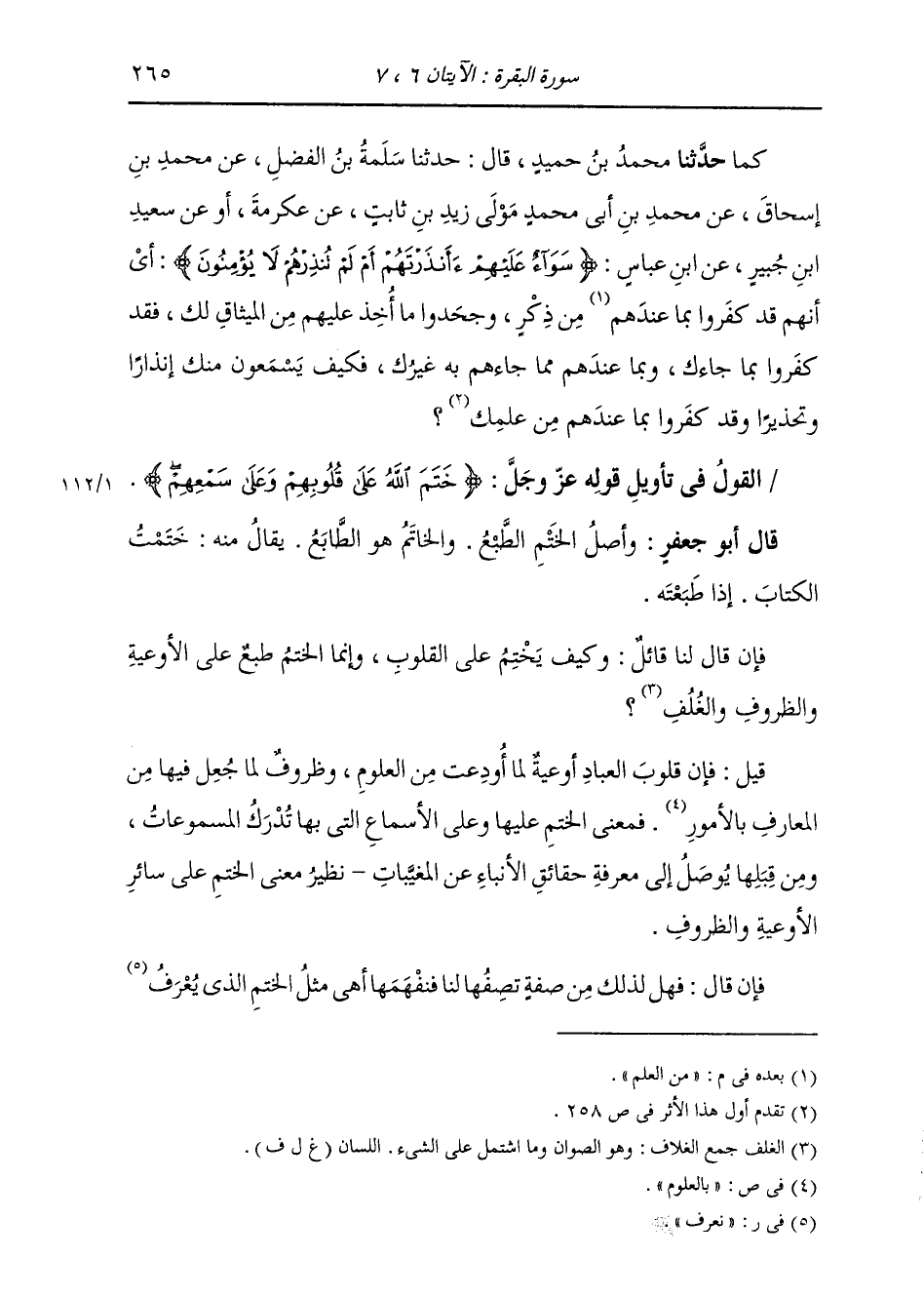 §الْقَوْلُ فِي تَأْوِيلِ قَوْلِهِ تَعَالَى: {خَتَمَ اللَّهُ عَلَى قُلُوبِهِمْ وَعَلَى سَمْعِهِمْ وَعَلَى أَبْصَارِهِمْ غِشَاوَةٌ وَلَهُمْ عَذَابٌ عَظِيمٌ} [البقرة: 7] وَأَصْلُ الْخَتْمِ: الطَّبْعُ، وَالْخَاتَمُ: هُوَ الطَّابَعُ يُقَالُ مِنْهُ: خَتَمْتُ الْكِتَابَ، إِذَا طَبَعْتُهُ. فَإِنْ قَالَ لَنَا قَائِلٌ: وَكَيْفَ يُخْتَمُ عَلَى الْقُلُوبِ، وَإِنَّمَا الْخَتْمُ طَبْعٌ عَلَى الْأَوْعِيَةِ وَالظُّرُوفِ وَالْغُلْفِ قِيلَ: فَإِنَّ قُلُوبَ الْعِبَادِ أَوْعِيَةٌ لِمَا أُودِعَتْ مِنَ الْعُلًومِ وَظُرُوفٌ لِمَا جُعِلَ فِيهَا مِنَ الْمَعَارِفِ بِالْأُمُورِ، فَمَعْنَى الْخَتْمِ عَلَيْهَا وَعَلَى الْأَسْمَاعِ الَّتِي بِهَا تُدْرَكُ الْمَسْمُوعَاتُ، وَمِنْ قَبْلِهَا يُوصَلُ إِلَى مَعْرِفَةِ حَقَائِقِ الْأَنْبَاءِ عَنِ الْمُغِيبَاتِ، نَظِيرَ مَعْنَى الْخَتْمِ عَلَى سَائِرِ الْأَوْعِيَةِ وَالظُّرُوفِ. فَإِنْ قَالَ: فَهَلْ لِذَلِكَ مِنْ صِفَةٍ تَصِفُهَا لَنَا فَنَفْهَمُهَا؟ أَهِيَ مِثْلُ الْخَتْمِ الَّذِي يُعْرَفُ