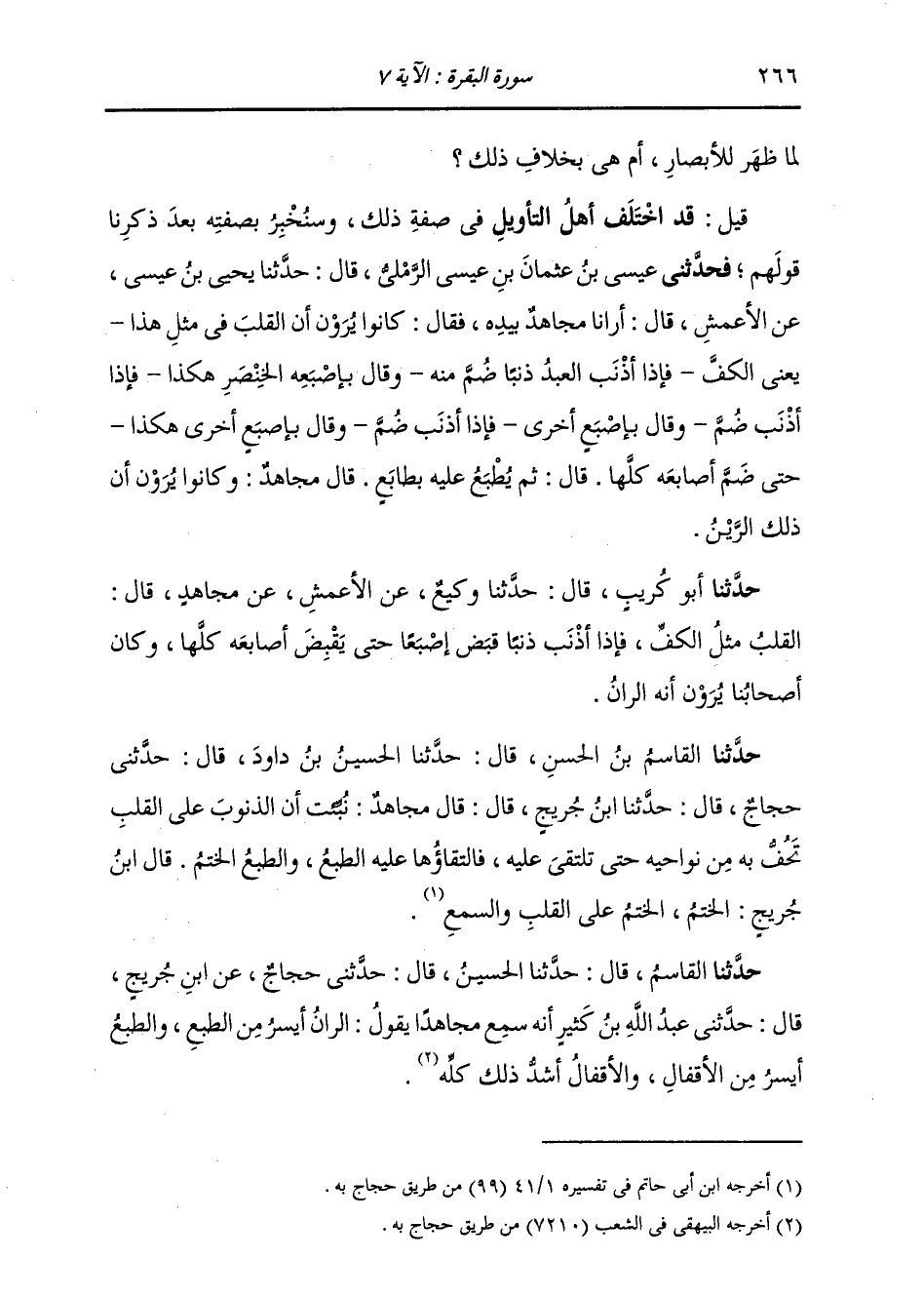 حَدَّثَنَا الْقَاسِمُ بْنُ الْحَسَنِ، قَالَ: حَدَّثَنَا الْحُسَيْنُ بْنُ دَاوُدَ، قَالَ: حَدَّثَنِي حَجَّاجٌ، قَالَ: حَدَّثَنَا ابْنُ جُرَيْجٍ، قَالَ: قَالَ مُجَاهِدٌ: «نُبِّئْتُ أَنَّ §الذُّنُوبَ عَلَى الْقَلْبِ تَحُفُّ بِهِ مِنْ نَوَاحِيهِ حَتَّى تَلْتَقِيَ عَلَيْهِ، فَالْتِقَاؤُهَا عَلَيْهِ الطَّبْعُ، وَالطَّبْعُ الْخَتْمُ» قَالَ ابْنُ جُرَيْجٍ: الْخَتْمُ خَتْمٌ عَلَى الْقَلْبِ وَالسَّمْعِ