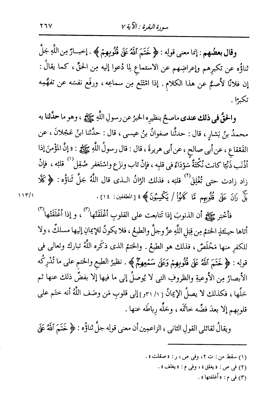 وَهُوَ مَا حَدَّثَنَا بِهِ، مُحَمَّدُ بْنُ يَسَارٍ، قَالَ: حَدَّثَنَا صَفْوَانُ بْنُ عِيسَى، قَالَ: حَدَّثَنَا ابْنُ عَجْلَانَ، عَنِ الْقَعْقَاعِ، عَنْ أَبِي صَالِحٍ، عَنْ أَبِي هُرَيْرَةَ، قَالَ: قَالَ رَسُولُ اللَّهِ صَلَّى اللهُ عَلَيْهِ وَسَلَّمَ: " إِنَّ §الْمُؤْمِنَ إِذَا أَذْنَبَ ذَنْبًا كَانَتْ نُكْتَةٌ سَوْدَاءُ فِي قَلْبِهِ، فَإِنْ تَابَ وَنَزَعَ وَاسْتَغْفَرَ صُقِلَ قَلْبُهُ، فَإِنْ زَادَ زَادَتْ حَتَّى يُغَلَّفَ قَلْبُهُ؛ فَذَلِكَ الرَّانُ الَّذِي قَالَ اللَّهُ جَلَّ ثَنَاؤُهُ: {كَلَّا بَلْ رَانَ عَلَى قُلُوبِهِمْ مَا كَانُوا يَكْسِبُونَ} [المطففين: 14] " فَأَخْبَرَ صَلَّى اللهُ عَلَيْهِ وَسَلَّمَ أَنَّ الذُّنُوبَ، إِذَا تَتَابَعَتْ عَلَى الْقُلُوبِ أَغْلَفَتْهَا، وَإِذَا أَغْلَفَتْهَا أَتَاهَا حِينَئِذٍ الْخَتْمُ مِنْ قِبَلِ اللَّهِ عَزَّ وَجَلَّ وَالطَّبْعُ، فَلَا يَكُونُ لِلْإِيمَانِ إِلَيْهَا مَسْلَكٌ، وَلَا لِلْكُفْرِ مِنْهَا مُخَلِّصٌ. فَذَلِكَ هُوَ الطَّبْعُ وَالْخَتْمُ الَّذِي ذَكَرَهُ اللَّهُ تَبَارَكَ وَتَعَالَى فِي قَوْلِهِ: {خَتَمَ اللَّهُ عَلَى قُلُوبِهِمْ وَعَلَى سَمْعِهِمْ} [البقرة: 7] نَظِيرُ الطَّبْعِ وَالْخَتْمِ عَلَى مَا تُدْرِكُهُ الْأَبْصَارُ مِنَ الْأَوْعِيَةِ وَالظُّرُوفِ الَّتِي لَا يُوصَلُ إِلَى مَا فِيهَا إِلَّا بِفَضِّ ذَلِكَ عَنْهَا ثُمَّ حِلِّهَا، فَكَذَلِكَ لَا يَصِلُّ الْإِيمَانُ إِلَى قُلُوبِ مِنْ وَصْفِ اللَّهِ أَنَّهُ خَتَمَ عَلَى قُلُوبِهِمْ، إِلَّا بَعْدَ فَضِّهِ خَاتَمَهُ وَحِلِّهِ رِبَاطَهُ عَنْهَا. وَيُقَالُ لِقَائِلِي الْقَوْلِ الثَّانِي الزَّاعِمِينَ أَنَّ مَعْنَى قَوْلِهِ جَلَّ ثَنَاؤُهُ: {خَتَمَ اللَّهُ عَلَى -[268]- قُلُوبِهِمْ وَعَلَى سَمْعِهِمْ} [البقرة: 7] هُوَ وَصْفُهُمْ بِالِاسْتِكْبَارِ وَالْإِعْرَاضِ عَنِ الَّذِي دُعُوا إِلَيْهِ مِنَ الْإِقْرَارِ بِالْحَقِّ تَكَبُّرًا: أَخْبِرُونَا عَنِ اسْتِكْبَارِ الَّذِينَ وَصَفَهُمُ اللَّهُ جَلَّ ثَنَاؤُهُ بِهَذِهِ الصِّفَةِ وَإِعْرَاضِهِمْ عَنِ الْإِقْرَارِ بِمَا دُعُوا إِلَيْهِ مِنَ الْإِيمَانِ وَسَائِرِ الْمَعَانِي اللَّوَاحِقِ بِهِ، أَفِعْلٌ مِنْهُمْ، أَمْ فِعْلٌ مِنَ اللَّهِ تَعَالَى ذِكْرُهُ بِهِمْ؟ فَإِنْ زَعَمُوا أَنَّ ذَلِكَ فِعْلٌ مِنْهُمْ وَذَلِكَ قَوْلُهُمْ، قِيلَ لَهُمْ: فَإِنَّ اللَّهَ تَبَارَكَ وَتَعَالَى قَدْ أَخْبَرَ أَنَّهُ هُوَ الَّذِي خَتَمَ عَلَى قُلُوبِهِمْ وَسَمْعِهِمْ، وَكَيْفَ يَجُوزُ أَنْ يَكُونَ إِعْرَاضُ الْكَافِرِ عَنِ الْإِيمَانِ وَتَكَبُّرُهُ عَنِ الْإِقْرَارِ بِهِ، وَهُوَ فِعْلُهُ عِنْدَكُمْ خَتْمًا مِنَ اللَّهِ عَلَى قَلْبِهِ وَسَمْعِهِ، وَخَتْمُهُ عَلَى قَلْبِهِ وَسَمْعِهِ فِعْلُ اللَّهِ عَزَّ وَجَلَّ دُونَ فِعْلِ الْكَافِرِ؟ فَإِنْ زَعَمُوا أَنَّ ذَلِكَ جَائِزٌ أَنْ يَكُونَ كَذَلِكَ، لِأَنَّ تَكَبُّرَهُ وَإِعْرَاضَهُ كَانَا عَنْ خَتْمِ اللَّهِ عَلَى قَلْبِهِ وَسَمْعِهِ، فَلَمَّا كَانَ الْخَتْمُ سَبَبًا لِذَلِكَ جَازَ أَنْ يُسَمَّى مُسَبِّبُهُ بِهِ؛ تَرَكُوا قَوْلَهُمْ، وَأَوْجَبُوا أَنَّ الْخَتْمَ مِنَ اللَّهِ عَلَى قُلُوبِ الْكُفَّارِ وَأَسْمَاعِهِمْ مَعْنَى غَيْرِ كُفْرِ الْكَافِرِ وَغَيْرِ تَكَبُّرِهِ وَإِعْرَاضِهِ عَنْ قَبُولِ الْإِيمَانِ وَالْإِقْرَارِ بِهِ، وَذَلِكَ دُخُولٌ فِيمَا أَنْكَرُوهُ. وَهَذِهِ الْآيَةُ مِنْ أَوْضَحِ الْأَدِلَّةِ عَلَى فَسَادِ قَوْلِ الْمُنْكِرِينَ تَكْلِيفَ مَا لَا يُطَاقُ إِلَّا بِمَعُونَةِ اللَّهِ؛ لِأَنَّ اللَّهَ جَلَّ ثَنَاؤُهُ أَخْبَرَ أَنَّهُ خَتَمَ عَلَى قُلُوبِ صِنْفٍ مِنْ كُفَّارِ عِبَادِهِ وَأَسْمَاعِهِمْ، ثُمَّ لَمْ يُسْقِطِ التَّكْلِيفَ عَنْهُمْ وَلَمْ يَضَعْ عَنْ أَحَدٍ مِ