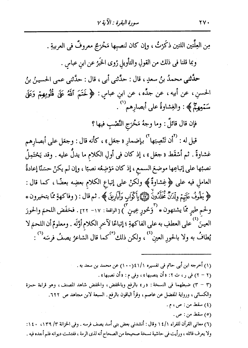 حَدَّثَنِي مُحَمَّدُ بْنُ سَعْدٍ، قَالَ: حَدَّثَنِي أَبِي، قَالَ: حَدَّثَنِي عَمِّي الْحُسَيْنُ بْنُ الْحَسَنِ، عَنْ أَبِيهِ، عَنْ جَدِّهِ، عَنِ ابْنِ عَبَّاسٍ: " {§خَتَمَ اللَّهُ عَلَى قُلُوبِهِمْ وَعَلَى سَمْعِهِمْ} [البقرة: 7] وَالْغِشَاوَةُ عَلَى أَبْصَارِهِمْ " فَإِنْ قَالَ قَائِلٌ: وَمَا وَجْهُ مَخْرَجِ النَّصْبِ فِيهَا؟ قِيلَ لَهُ: إِنْ نَصَبَهَا بِإِضْمَارِ جَعَلَ كَأَنَّهُ قَالَ: وَجَعَلَ عَلَى أَبْصَارِهِمْ غِشَاوَةً؛ ثُمَّ أَسْقَطَ جَعَلَ؛ إِذْ كَانَ فِي أَوَّلِ الْكَلَامِ مَا يَدُلُّ عَلَيْهِ. وَقَدْ يَحْتَمِلُ نَصَبُهَا عَلَى اتِّبَاعِهَا مَوْضِعَ السَّمْعِ إِذْ كَانَ مَوْضِعُهُ نَصْبًا، وَإِنْ لَمْ يَكُنْ حَسَنًا إِعَادَةُ الْعَامِلِ فِيهِ عَلَى غِشَاوَةٍ وَلَكِنْ عَلَى إِتْبَاعِ الْكَلَامِ بَعْضَهُ بَعْضًا، كَمَا قَالَ تَعَالَى ذِكْرُهُ: {يَطُوفُ عَلَيْهِمْ وِلْدَانٌ مُخَلَّدُونَ بِأَكْوَابٍ وَأَبَارِيقَ} [الواقعة: 18] ثُمَّ قَالَ: {وَفَاكِهَةٍ مِمَّا يَتَخَيَّرُونَ وَلَحْمِ طَيْرٍ مِمَّا يَشْتَهُونَ وَحُورٍ عِينٍ} [الواقعة: 20] فَخَفَضَ اللَّحْمَ وَالْحُورَ عَلَى الْعَطْفِ بِهِ عَلَى الْفَاكِهَةِ إِتْبَاعًا لِآخِرِ الْكَلَامِ أَوَّلَهُ. وَمَعْلُومٌ أَنَّ اللَّحْمَ لَا يُطَافُ بِهِ وَلَا بِالْحُورِ، وَلَكِنَّ ذَلِكَ كَمَا قَالَ الشَّاعِرُ يَصِفُ فَرَسَهُ -[271]-: