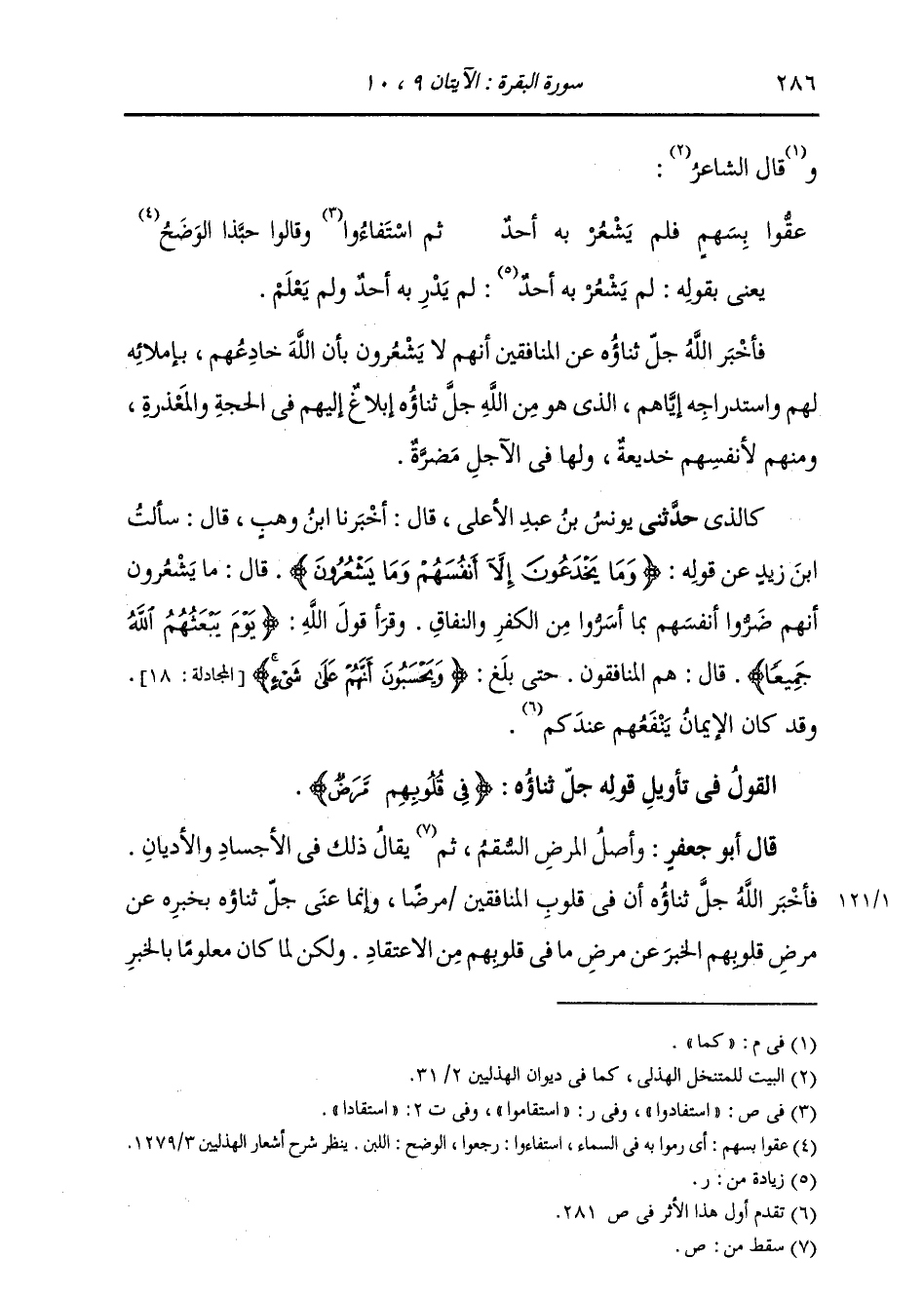 §الْقَوْلُ فِي تَأْوِيلِ قَوْلِهِ تَعَالَى: {فِي قُلُوبِهِمْ مَرَضٌ فَزَادَهُمُ اللهُ مَرَضًا وَلَهُمْ عَذَابٌ أَلِيمٌ بِمَا كَانُوا يَكْذِبُونَ} [البقرة: 10] وَأَصْلُ الْمَرَضِ: السَّقَمُ، ثُمَّ يُقَالُ ذَلِكَ فِي الْأَجْسَادِ وَالْأَدْيَانِ فَأَخْبَرَ اللَّهُ جَلَّ ثَنَاؤُهُ أَنَّ فِيَ قُلُوبِ الْمُنَافِقِينَ مَرَضًا. وَإِنَّمَا عَنَى تَبَارَكَ وَتَعَالَى بِخَبَرِهِ عَنْ مَرَضِ قُلُوبِهِمُ الْخَبَرَ عَنْ مَرَضِ مَا فِي قُلُوبِهِمْ مِنَ الِاعْتِقَادِ، وَلَكِنْ لَمَّا كَانَ مَعْلُومًا بِالْخَبَرِ