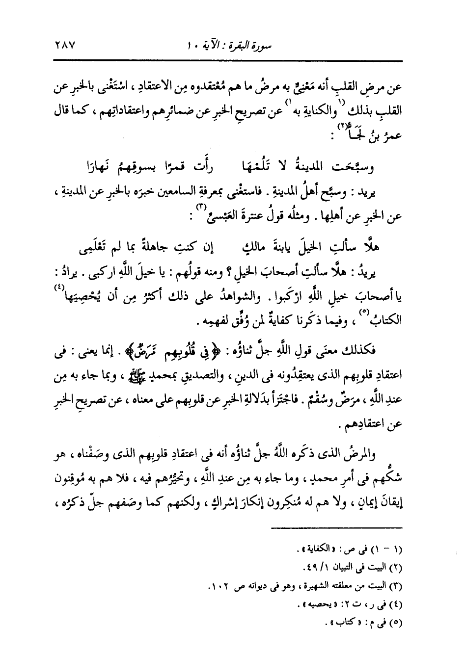 يُرِيدُ: هَلَّا سَأَلْتِ أَصْحَابَ الْخَيْلِ؟ وَمِنْهُ قَوْلُهُمْ: يَا خَيْلَ اللَّهِ ارْكَبِي، يُرَادُ: يَا أَصْحَابَ خَيْلِ اللَّهِ ارْكَبُوا. وَالشَّوَاهِدُ عَلَى ذَلِكَ أَكْثَرُ مِنْ أَنْ يُحْصِيَهَا كِتَابٌ، وَفِيمَا ذَكَرْنَا كِفَايَةٌ لِمَنْ وُفِّقَ لِفَهْمِهِ. فَكَذَلِكَ مَعْنَى قَوْلِ اللَّهِ جَلَّ ثَنَاؤُهُ: {فِي قُلُوبِهِمْ مَرَضٌ} [البقرة: 10] إِنَّمَا يَعْنِي فِي اعْتِقَادِ قُلُوبِهِمُ الَّذِي يَعْتَقِدُونَهُ فِي الدِّينِ وَالتَّصْدِيقِ بِمُحَمَّدٍ صَلَّى اللهُ عَلَيْهِ وَسَلَّمَ، وَبِمَا جَاءَ بِهِ مِنْ عِنْدِ اللَّهِ مَرَضٌ وَسَقَمُ. فَاجْتَزَأَ بِدَلَالَةِ الْخَبَرِ عَنْ قُلُوبِهِمْ عَلَى مَعْنَاهُ عَنْ تَصْرِيحِ الْخَبَرِ عَنِ اعْتِقَادِهِمْ. وَالْمَرَضُ الَّذِي ذَكَرَ اللَّهُ جَلَّ ثَنَاؤُهُ أَنَّهُ فِي اعْتِقَادِ قُلُوبِهِمُ الَّذِي وَصَفْنَاهُ هُوَ شَكُّهُمْ فِي أَمْرِ مُحَمَّدٍ، وَمَا جَاءَ بِهِ مِنْ عِنْدِ اللَّهِ وَتَحَيُّرِهِمْ فِيهِ، فَلَا هُمْ بِهِ مُوقِنُونَ إِيقَانَ إِيمَانٍ، وَلَا هُمْ لَهُ مُنْكَرُونَ إِنْكَارَ إِشْرَاكٍ؛ وَلَكِنَّهُمْ كَمَا وَصَفَهُمُ اللَّهُ عَزَّ وَجَلَّ