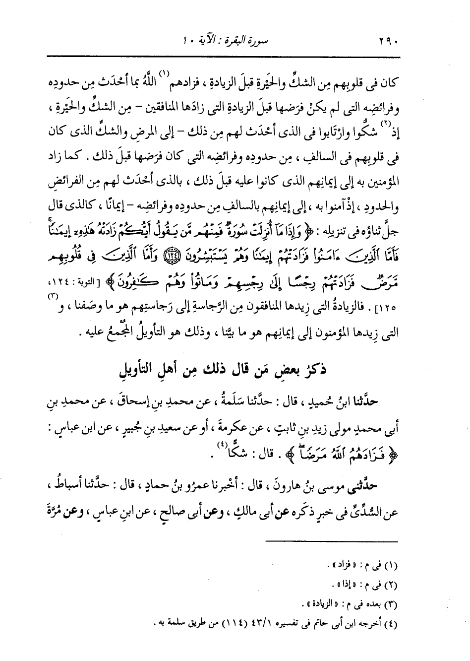 ذِكْرُ بَعْضِ مَنْ قَالَ ذَلِكَ مِنْ أَهْلِ التَّأْوِيلِ حَدَّثَنَا ابْنُ حُمَيْدٍ، قَالَ: حَدَّثَنَا سَلَمَةُ، عَنْ مُحَمَّدِ بْنِ إِسْحَاقَ، عَنْ مُحَمَّدِ بْنِ أَبِي مُحَمَّدٍ، مَوْلَى زَيْدِ بْنِ ثَابِتٍ، عَنْ عِكْرِمَةَ أَوْ عَنْ سَعِيدِ بْنِ جُبَيْرٍ، عَنِ ابْنِ عَبَّاسٍ: " {§فَزَادَهُمُ اللَّهُ مَرَضًا} [البقرة: 10] قَالَ: شَكًّا "
