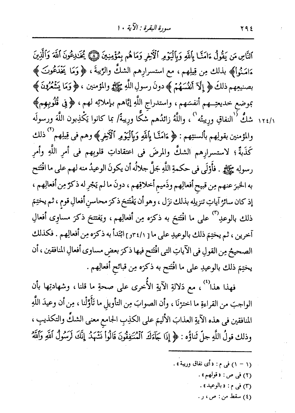 النَّاسِ مَنْ يَقُولُ آمَنَّا بِاللَّهِ وَبِالْيَوْمِ الْآخِرِ وَمَا هُمْ بِمُؤْمِنِينَ يُخَادِعُونَ اللَّهَ وَالَّذِينَ آمَنُوا} [البقرة: 9] بِذَلِكَ مِنْ قِيلِهِمْ مَعَ اسْتِسْرَارِهِمُ الشَّكَّ وَالرِّيبَةَ {وَمَا يَخْدَعُونَ} [البقرة: 9] بِصَنِيعِهِمْ ذَلِكَ {إِلَّا أَنْفُسَهُمْ} [البقرة: 9] دُونَ رَسُولِ اللَّهِ صَلَّى اللهُ عَلَيْهِ وَسَلَّمَ وَالْمُؤْمِنِينَ {وَمَا يَشْعُرُونَ} [البقرة: 9] بِمَوْضِعِ خَدِيعَتِهِمْ أَنْفُسَهُمْ وَاسْتِدْرَاجِ اللَّهِ عَزَّ وَجَلَّ إِيَّاهُمْ بِإِمْلَائِهِ لَهُمْ {فِي قُلُوبِهِمْ مَرَضٌ} [البقرة: 10] أَيْ نِفَاقٌ وَرِيبَةٌ، وَاللَّهُ زَائِدُهُمْ شَكًّا وَرِيبَةً بِمَا كَانُوا يَكْذِبُونَ اللَّهَ وَرَسُولَهُ وَالْمُؤْمِنِينَ بِقَوْلِهِمْ بِأَلْسِنَتِهِمْ: {آمَنَّا بِاللَّهِ وَبِالْيَوْمِ الْآخِرِ} [البقرة: 8] وَهُمْ فِي قِيلِهِمْ ذَلِكَ كَذَبَةٌ لِاسْتِسْرَارِهِمُ الشَّكَّ وَالْمَرَضَ فِي اعْتِقَادَاتِ قُلُوبِهِمْ. فِي أَمْرِ اللَّهِ وَأَمْرِ رَسُولِهِ صَلَّى اللهُ عَلَيْهِ وَسَلَّمَ، فَأَوْلَى فِي حِكْمَةِ اللَّهِ جَلَّ جَلَالُهُ أَنْ يَكُونَ الْوَعِيدُ مِنْهُ لَهُمْ عَلَى مَا افْتَتَحَ بِهِ الْخَبَرَ عَنْهُمْ مِنْ قَبِيحِ أَفْعَالِهِمْ وَذَمِيمِ أَخْلَاقِهِمْ، دُونَ مَا لَمْ يَجْرِ لَهُ ذِكْرٌ مِنْ أَفْعَالِهِمْ؛ إِذْ كَانَ سَائِرُ آيَاتِ تَنْزِيلِهِ بِذَلِكَ نَزَلَ. وَهُوَ أَنْ يَفْتَتِحَ ذِكْرَ مَحَاسِنِ أَفْعَالِ قَوْمٍ ثُمَّ يَخْتِمُ ذَلِكَ بِالْوَعِيدِ عَلَى مَا افْتَتَحَ بِهِ ذِكْرَهُ مِنْ أَفْعَالِهِمْ، وَيَفْتَتِحُ ذِكْرَ مَسَاوِئِ أَفْعَالِ آخَرِينَ ثُمَّ يَخْتِمُ ذَلِكَ بِالْوَعِيدِ عَلَى مَا ابْتَدَأَ بِهِ ذِكْرَهُ مِنْ أَفْعَالِهِمْ. فَكَذَلِكَ الصَّحِيحُ مِنَ الْقَوْلِ فِي الْآيَاتِ الَّتِي افْتَتَحَ فِيهَا ذِكْرَ بَعْضِ مَسَاوِئِ أَفْعَالِ الْمُنَافِقِينَ أَنْ يَخْتِمَ ذَلِكَ بِالْوَعِيدِ عَلَى مَا افْتَتَحَ بِهِ ذِكْرَهُ مِنْ قَبَائِحِ أَفْعَالِهِمْ، فَهَذَا مَعَ دَلَالَةِ الْآيَةِ الْأُخْرَى عَلَى صِحَّةِ مَا قُلْنَا وَشَهَادَتِهَا بِأَنَّ الْوَاجِبَ مِنَ الْقِرَاءَةِ مَا اخْتَرْنَا، وَأَنَّ الصَّوَابَ مِنَ التَّأْوِيلِ مَا تَأَوَّلْنَا مِنْ أَنَّ وَعِيدَ اللَّهِ الْمُنَافِقِينَ فِي هَذِهِ الْآيَةِ الْعَذَابَ الْأَلِيمَ عَلَى الْكَذِبِ الْجَامِعِ مَعْنَى الشَّكِّ وَالتَّكْذِيبِ، وَذَلِكَ قَوْلُ اللَّهِ تَبَارَكَ وَتَعَالَى: {إِذَا جَاءَكَ الْمُنَافِقُونَ قَالُوا نَشْهَدُ إِنَّكَ لَرَسُولُ اللَّهِ وَاللَّهُ