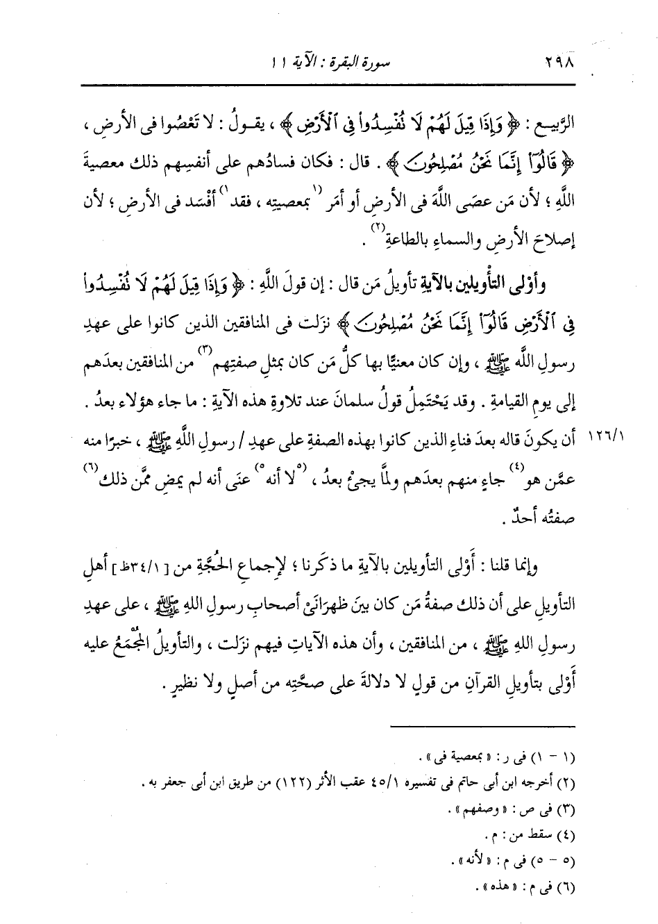 الرَّبِيعِ: " {وَإِذَا قِيلَ لَهُمْ لَا تُفْسِدُوا فِي الْأَرْضِ} [البقرة: 11] يَقُولُ: §لَا تَعْصُوا فِي الْأَرْضِ. قَالَ: فَكَانَ فَسَادُهُمْ عَلَى أَنْفُسِهِمْ ذَلِكَ مَعْصِيَةَ اللَّهِ جَلَّ ثَنَاؤُهُ، لِأَنَّ مَنْ عَصَى اللَّهَ فِي الْأَرْضِ أَوْ أَمَرَ بِمَعْصِيَتِهِ فَقَدْ أَفْسَدَ فِي الْأَرْضِ، لِأَنَّ إِصْلَاحَ الْأَرْضِ وَالسَّمَاءِ بِالطَّاعَةِ " وَأَوْلَى التَّأْوِيلَيْنِ بِالْآيَةِ تَأْوِيلُ مَنْ قَالَ: إِنَّ قَوْلَ اللَّهِ تَبَارَكَ اسْمُهُ: {وَإِذَا قِيلَ لَهُمْ لَا تُفْسِدُوا فِي الْأَرْضِ قَالُوا إِنَّمَا نَحْنُ مُصْلِحُونَ} [البقرة: 11] نَزَلَتْ فِي الْمُنَافِقِينَ الَّذِينَ كَانُوا عَلَى عَهْدِ رَسُولِ اللَّهِ صَلَّى اللهُ عَلَيْهِ وَسَلَّمَ، وَإِنْ كَانَ مَعْنِيًّا بِهَا كُلُّ مَنْ كَانَ بِمِثْلِ صِفَتِهِمْ مِنَ الْمُنَافِقِينَ بَعْدَهُمْ إِلَى يَوْمِ الْقِيَامَةِ. وَقَدْ يَحْتَمِلُ قَوْلُ سَلْمَانَ عِنْدَ تِلَاوَةِ هَذِهِ الْآيَةِ: مَا جَاءَ هَؤُلَاءِ بَعْدُ، أَنْ يَكُونَ قَالَهُ بَعْدَ فَنَاءِ الَّذِينَ كَانُوا بِهَذِهِ الصِّفَةِ عَلَى عَهْدِ رَسُولِ اللَّهِ صَلَّى اللهُ عَلَيْهِ وَسَلَّمَ خَبَرًا مِنْهُ عَمَّنْ جَاءَ مِنْهُمْ بَعْدَهُمْ وَلَمَّا يَجِئْ بَعْدُ، لَا أَنَّهُ عَنَى أَنَّهُ لَمْ يَمْضِ مِمَّنْ هَذِهِ صِفَتُهُ أَحَدٌ. وَإِنَّمَا قُلْنَا أَوْلَى التَّأْوِيلَيْنِ بِالْآيَةِ مَا ذَكَرْنَا، لِإِجْمَاعِ الْحُجَّةِ مِنْ أَهْلِ التَّأْوِيلِ عَلَى أَنَّ ذَلِكَ صِفَةُ مَنْ كَانَ بَيْنَ ظَهْرَانَيْ أَصْحَابِ رَسُولِ اللَّهِ صَلَّى اللهُ عَلَيْهِ وَسَلَّمَ عَلَى عَهْدِ رَسُولِ اللَّهِ صَلَّى اللهُ عَلَيْهِ وَسَلَّمَ مِنَ الْمُنَافِقِينَ، وَأَنَّ هَذِهِ الْآيَاتِ فِيهِمْ نَزَلَتْ. وَالتَّأْوِيلُ الْمُجْمَعُ عَلَيْهِ أَوْلَى بِتَأْوِيلِ الْقُرْآنِ مِنْ قَوْلٍ لَا دَلَالَةَ عَلَى صِحَّتِهِ مِنْ أَصْلٍ وَلَا نَظِيرٍ.