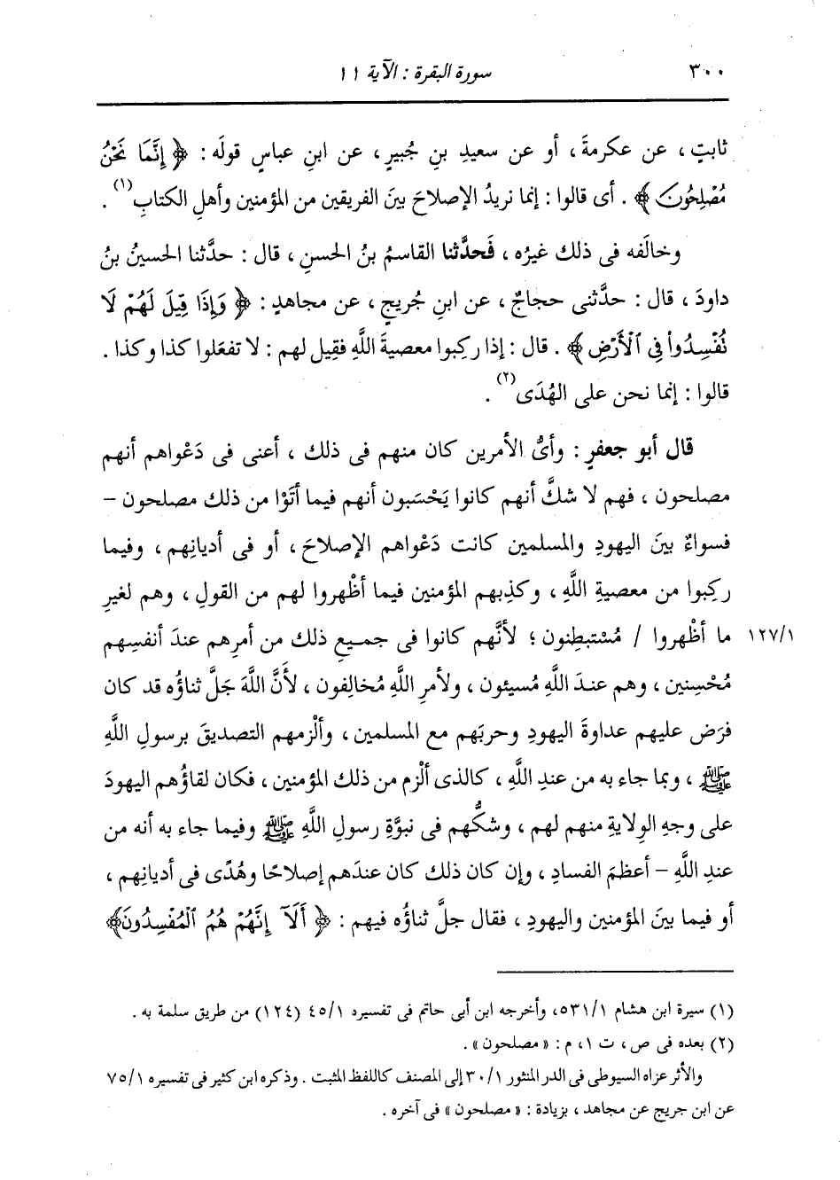 حَدَّثَنَا الْقَاسِمُ بْنُ الْحَسَنِ، قَالَ: حَدَّثَنَا الْحُسَيْنُ بْنُ دَاوُدَ، قَالَ: حَدَّثَنِي حَجَّاجٌ، عَنِ ابْنِ جُرَيْجٍ، عَنْ مُجَاهِدٍ: " {وَإِذَا قِيلَ لَهُمْ لَا تُفْسِدُوا فِي الْأَرْضِ} [البقرة: 11] قَالَ: §إِذَا رَكِبُوا مَعْصِيَةَ اللَّهِ، فَقِيلَ لَهُمْ: لَا تَفْعَلُوا كَذَا وَكَذَا، قَالُوا: إِنَّمَا نَحْنُ عَلَى الْهُدَى مُصْلِحُونَ " قَالَ أَبُو جَعْفَرٍ: وَأَيُّ الْأَمْرَيْنِ كَانَ مِنْهُمْ فِي ذَلِكَ، أَعْنِي فِي دَعْوَاهُمْ أَنَّهُمْ مُصْلِحُونَ، فَهُمْ لَا شَكَّ أَنَّهُمْ كَانُوا يَحْسَبُونَ أَنَّهُمْ فِيمَا أَتَوْا مِنْ ذَلِكَ مُصْلِحُونَ. فَسَوَاءٌ بَيْنَ الْيَهُودِ وَالْمُسْلِمِينَ كَانَتْ دَعْوَاهُمُ الْإِصْلَاحَ أَوْ فِي أَدْيَانِهِمْ، وَفِيمَا رَكِبُوا مِنْ مَعْصِيَةِ اللَّهِ، وَكَذِبِهِمُ الْمُؤْمِنِينَ فِيمَا أَظْهَرُوا لَهُمْ مِنَ الْقَوْلِ وَهُمْ لِغَيْرِ مَا أَظْهَرُوا مُسْتَبْطِنُونَ، لِأَنَّهُمْ كَانُوا فِي جَمِيعِ ذَلِكَ مِنْ أَمْرِهِمْ عِنْدَ أَنْفُسِهِمْ مُحْسِنِينَ، وَهُمْ عِنْدَ اللَّهِ مُسِيئُونَ، وَلِأَمْرِ اللَّهِ مُخَالِفُونَ؛ لِأَنَّ اللَّهَ جَلَّ ثَنَاؤُهُ قَدْ كَانَ فَرَضَ عَلَيْهِمْ عَدَاوَةَ الْيَهُودِ وَحَرْبَهُمْ مَعَ الْمُسْلِمِينِ، وَأَلْزَمَهُمُ التَّصْدِيقَ بِرَسُولِ اللَّهِ صَلَّى اللهُ عَلَيْهِ وَسَلَّمَ وَبِمَا جَاءَ بِهِ مِنْ عِنْدِ اللَّهِ كَالَّذِي أَلْزَمُ مِنْ ذَلِكَ الْمُؤْمِنِينَ، فَكَانَ لِقَاؤُهُمُ الْيَهُودَ عَلَى وَجْهِ الْوَلَايَةِ مِنْهُمْ لَهُمْ، وَشَكِّهِمْ فِي نُبُوَّةِ رَسُولِ اللَّهِ صَلَّى اللهُ عَلَيْهِ وَسَلَّمَ وَفِيمَا جَاءَ بِهِ أَنَّهُ مِنْ عِنْدِ اللَّهِ أَعْظَمُ الْفَسَادِ، وَإِنْ كَانَ ذَلِكَ كَانَ عِنْدَهُمْ إِصْلَاحًا وَهُدًى: فِي أَدْيَانِهِمْ، أَوْ فِيمَا بَيْنَ الْمُؤْمِنِينَ وَالْيَهُودِ، فَقَالَ جَلَّ ثَنَاؤُهُ فِيهِمْ: {أَلَا إِنَّهُمْ هُمُ الْمُفْسِدُونَ