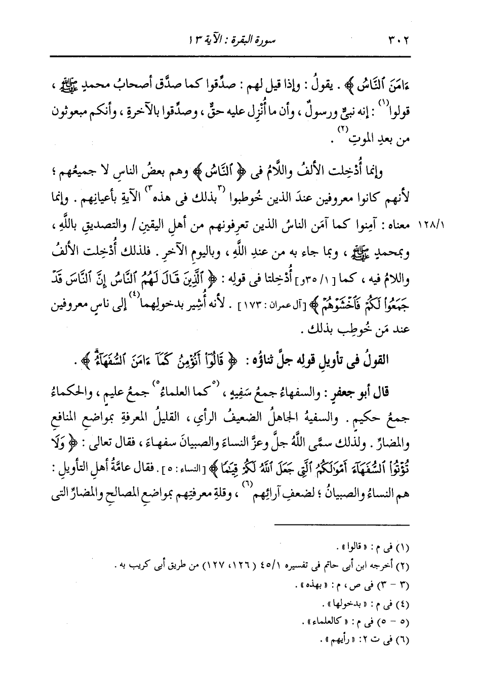 §الْقَوْلُ فِي تَأْوِيلِ قَوْلِهِ تَعَالَى: {قَالُوا أَنُؤْمِنُ كَمَا آمَنَ السُّفَهَاءُ} [البقرة: 13] قَالَ أَبُو جَعْفَرٍ: وَالسُّفَهَاءُ جَمْعُ سَفِيهٍ، كَالْعُلَمَاءِ جَمْعُ عَلِيمٍ، وَالْحُكَمَاءِ جَمْعُ حَكِيمٍ وَالسَّفِيهُ: الْجَاهِلُ الضَّعِيفُ الرَّأْيِ، الْقَلِيلُ الْمَعْرِفَةِ بِمَوَاضِعِ الْمَنَافِعِ وَالْمَضَارِّ وَلِذَلِكَ سَمَّى اللَّهُ عَزَّ وَجَلَّ النِّسَاءَ وَالصِّبْيَانَ سُفَهَاءَ، فَقَالَ تَعَالَى: {وَلَا تُؤْتُوا السُّفَهَاءَ أَمْوَالَكُمُ الَّتِي جَعَلَ اللَّهُ لَكُمْ قِيَامًا} [النساء: 5] فَقَالَ عَامَّةُ أَهْلِ التَّأْوِيلِ: هُمُ النِّسَاءُ وَالصِّبْيَانُ لِضَعْفِ آرَائِهِمْ، وَقِلَّةِ مَعْرِفَتِهِمْ بِمَوَاضِعِ الْمَصَالِحِ وَالْمَضَارِّ الَّتِي