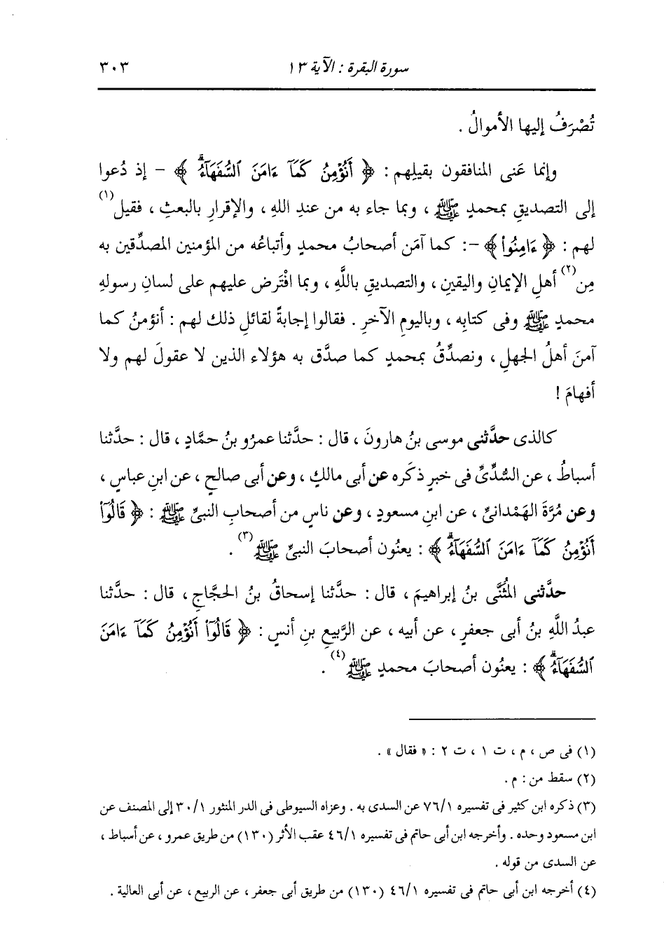 كَالَّذِي حَدَّثَنِي مُوسَى بْنُ هَارُونَ، قَالَ: حَدَّثَنَا عَمْرُو بْنُ حَمَّادٍ، قَالَ: حَدَّثَنَا أَسْبَاطٌ، عَنِ السُّدِّيِّ، فِي خَبَرٍ ذَكَرَهُ عَنْ أَبِي مَالِكٍ، وَعَنْ أَبِي صَالِحٍ، عَنِ ابْنِ عَبَّاسٍ، وَعَنْ مُرَّةَ الْهَمْدَانِيِّ، عَنِ ابْنِ مَسْعُودٍ، وَعَنْ نَاسٍ مِنْ أَصْحَابِ النَّبِيِّ صَلَّى اللهُ عَلَيْهِ وَسَلَّمَ، قَالُوا: " {§أَنُؤْمِنُ كَمَا آمَنَ السُّفَهَاءُ} [البقرة: 13] يَعْنُونَ أَصْحَابَ النَّبِيِّ صَلَّى اللهُ عَلَيْهِ وَسَلَّمَ "