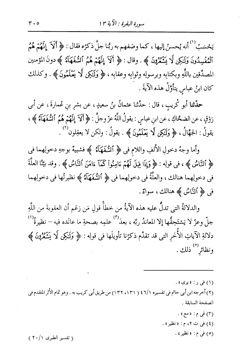 حَدَّثَنَا أَبُو كُرَيْبٍ، قَالَ: حَدَّثَنَا عُثْمَانُ بْنُ سَعِيدٍ، عَنْ بِشْرِ بْنِ عَمَّارٍ، عَنْ أَبِي رَوْقٍ، عَنِ الضَّحَّاكِ، عَنِ ابْنِ عَبَّاسٍ، " يَقُولُ اللَّهُ جَلَّ ثَنَاؤُهُ: {§أَلَا إِنَّهُمْ هُمُ السُّفَهَاءُ} [البقرة: 13] يَقُولُ: الْجُهَّالُ {وَلَكِنْ لَا يَعْلَمُونَ} [البقرة: 13] يَقُولُ: وَلَكِنْ لَا يَعْقِلُونَ " وَأَمَّا وَجْهُ دُخُولِ الْأَلْفِ وَاللَّامِ فِي السُّفَهَاءِ فَشَبِيهٌ بِوَجْهِ دُخُولِهِمَا فِي النَّاسِ فِي قَوْلِهِ: {وَإِذَا قِيلَ لَهُمْ آمِنُوا كَمَا آمَنَ النَّاسُ} [البقرة: 13] وَقَدْ بَيَّنَّا الْعِلَّةَ فِي دُخُولِهِمَا هُنَالِكَ، وَالْعِلَّةُ فِي دُخُولِهِمَا فِي السُّفَهَاءِ نَظِيرَتُهَا فِي دُخُولِهِمَا فِي النَّاسِ هُنَالِكَ سَوَاءٌ. وَالدَّلَالَةُ الَّتِي تَدُلُّ عَلَيْهِ هَذِهِ الْآيَةُ مِنْ خَطَأِ قَوْلِ مَنْ زَعَمَ أَنَّ الْعُقُوبَةَ مِنَ اللَّهِ لَا يَسْتَحِقُّهَا إِلَّا الْمُعَانِدُ رَبَّهُ مَعَ عِلْمِهِ بِصِحَّةِ مَا عَانَدَهُ فِيهِ نَظِيرُ دَلَالَةِ الْآيَاتِ الْأُخَرِ الَّتِي قَدْ تَقَدَّمَ ذِكْرُنَا تَأْوِيلَهَا فِي قَوْلِهِ: {وَلَكِنْ لَا يَشْعُرُونَ} [البقرة: 12] وَنَظَائِرُ ذَلِكَ