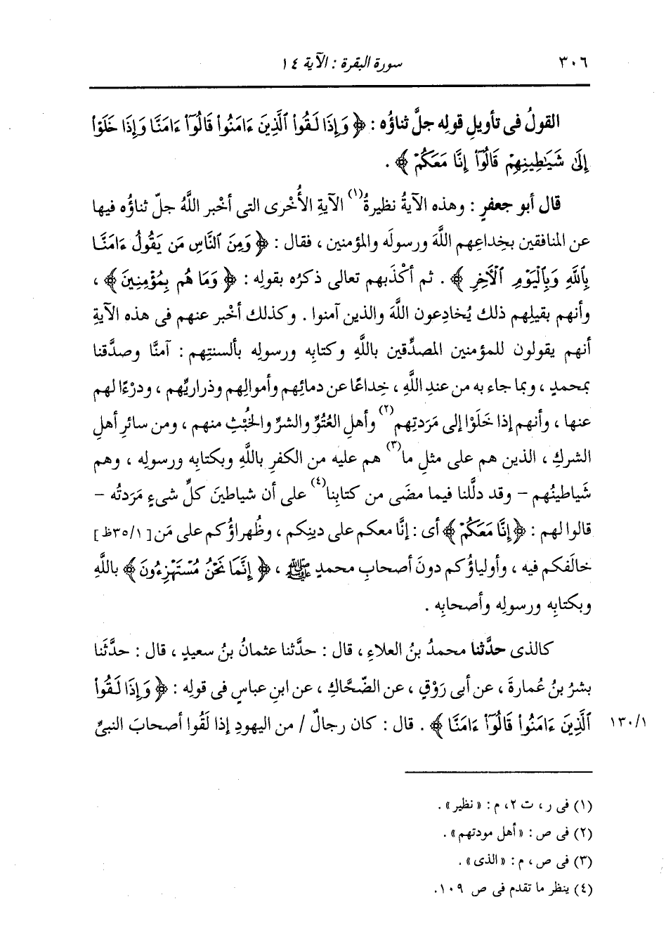 كَالَّذِي حَدَّثَنَا مُحَمَّدُ بْنُ الْعَلَاءِ: قَالَ: حَدَّثَنَا عُثْمَانُ بْنُ سَعِيدٍ، قَالَ حَدَّثَنَا بِشْرُ بْنُ عَمَّارٍ، عَنْ أَبِي رَوْقٍ، عَنِ الضَّحَّاكِ، عَنِ ابْنِ عَبَّاسٍ، فِي قَوْلِهِ: " {وَإِذَا لَقُوا الَّذِينَ آمَنُوا قَالُوا آمَنَّا} [البقرة: 14] قَالَ: §كَانَ رِجَالٌ مِنَ الْيَهُودِ إِذَا لَقُوا أَصْحَابَ النَّبِيِّ صَلَّى اللهُ عَلَيْهِ وَسَلَّمَ -[307]- أَوْ بَعْضَهُمْ، قَالُوا: إِنَّا عَلَى دِينِكُمْ، وَإِذَا خَلَوْا إِلَى أَصْحَابِهِمْ وَهُمْ شَيَاطِينُهُمْ {قَالُوا إِنَّا مَعَكُمْ إِنَّمَا نَحْنُ مُسْتَهْزِئُونَ} "