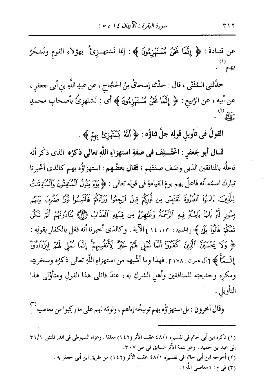 §الْقَوْلُ فِي تَأْوِيلِ قَوْلِهِ تَعَالَى: {اللَّهُ يَسْتَهْزِئُ بِهِمْ وَيَمُدُّهُمْ فِي طُغْيَانِهِمْ يَعْمَهُونَ} [البقرة: 15] قَالَ أَبُو جَعْفَرٍ: اخْتُلِفَ فِي صِفَةِ اسْتِهْزَاءِ اللَّهِ جَلَّ جَلَالُهُ الَّذِي ذَكَرَ أَنَّهُ فَاعِلُهُ بِالْمُنَافِقِينَ الَّذِينَ وَصَفَ صِفَتَهُمْ. فَقَالَ بَعْضُهُمُ: اسْتِهْزَاؤُهُ بِهِمْ كَالَّذِي أَخْبَرَنَا تَبَارَكُ اسْمُهُ أَنَّهُ فَاعِلٌ بِهِمْ يَوْمَ الْقِيَامَةِ فِي قَوْلِهِ تَعَالَى: {يَوْمَ يَقُولُ الْمُنَافِقُونَ وَالْمُنَافِقَاتُ لِلَّذِينَ آمَنُوا انْظُرُونَا نَقْتَبِسْ مِنْ نُورِكُمْ قِيلَ ارْجِعُوا وَرَاءَكُمْ فَالْتَمِسُوا نُورًا فَضُرِبَ بَيْنَهُمْ بِسُوَرٍ لَهُ بَابٌ بَاطِنُهُ فِيهِ الرَّحْمَةُ وَظَاهِرُهُ مِنْ قِبَلِهِ الْعَذَابُ يُنَادُونَهُمْ أَلَمْ نَكُنْ مَعَكُمْ قَالُوا بَلَى} [الحديد: 14] الْآيَةُ، وَكَالَّذِي أَخْبَرَنَا أَنَّهُ فَعَلَ بِالْكُفَّارِ بِقَوْلِهِ: {وَلَا يَحْسَبَنَّ الَّذِينَ كَفَرُوا أَنَّمَا نُمْلِي لَهُمْ خَيْرٌ لِأَنْفُسِهِمْ إِنَّمَا نُمْلِي لَهُمْ لِيَزْدَادُوا إِثْمًا} [آل عمران: 178] فَهَذَا وَمَا أَشْبَهَهُ مِنَ اسْتِهْزَاءِ اللَّهِ جَلَّ وَعَزَّ وَسُخْرِيَتِهِ وَمَكْرِهِ وَخَدِيعَتِهِ لِلْمُنَافِقِينَ وَأَهْلِ الشِّرْكِ بِهِ، عِنْدَ قَائِلِي هَذَا الْقَوْلِ وَمُتَأَوِّلِي هَذَا التَّأْوِيلِ. وَقَالَ آخَرُونَ: بَلِ اسْتِهْزَاؤُهُ بِهِمْ: تَوْبِيخُهُ إِيَّاهُمْ وَلَوْمُهُ لَهُمْ عَلَى مَا رَكِبُوا مِنْ مَعَاصِي اللَّهِ