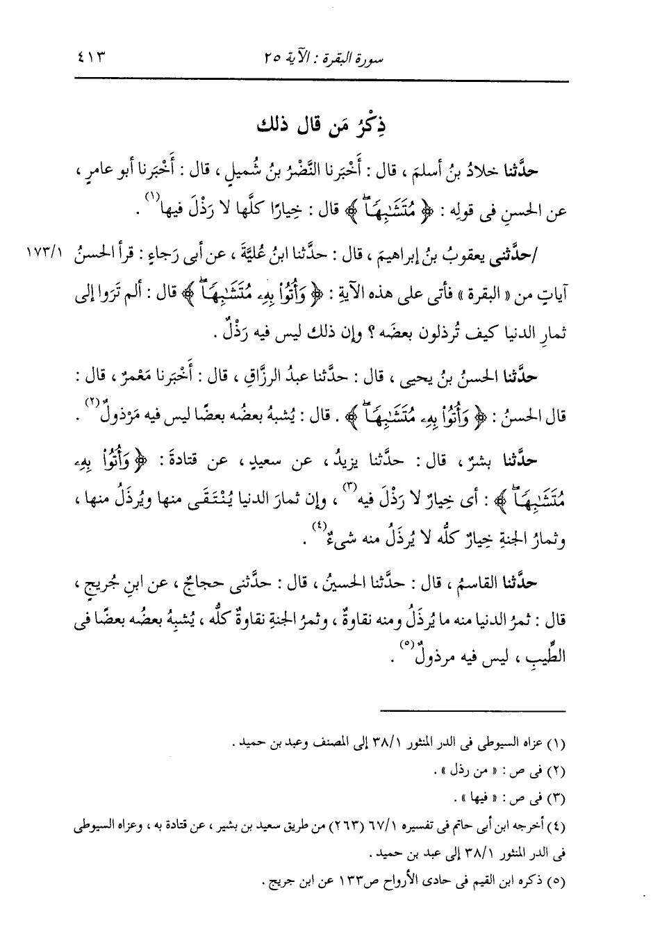 ذِكْرُ مَنْ قَالَ ذَلِكَ حَدَّثَنَا خَلَّادُ بْنُ أَسْلَمَ، قَالَ: أَخْبَرَنَا النَّضْرُ بْنُ شُمَيْلٍ، قَالَ: أَخْبَرَنَا أَبُو عَامِرٍ، عَنِ الْحَسَنِ " فِي قَوْلِهِ: {§مُتَشَابِهًا} [البقرة: 25] قَالَ: خِيَارًا كُلَّهَا لَا رَذْلَ فِيهَا "