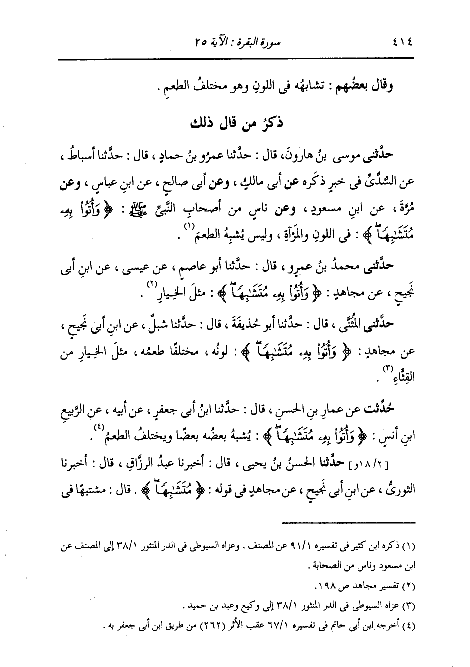 ذِكْرُ مَنْ قَالَ ذَلِكَ حَدَّثَنِي مُوسَى، قَالَ: حَدَّثَنَا عَمْرٌو، قَالَ: حَدَّثَنَا أَسْبَاطٌ، عَنِ السُّدِّيِّ، فِي خَبَرٍ ذَكَرَهُ، عَنْ أَبِي مَالِكٍ، وَعَنْ أَبِي صَالِحٍ، عَنِ ابْنِ عَبَّاسٍ، وَعَنْ مُرَّةَ، عَنِ ابْنِ مَسْعُودٍ، وَعَنْ نَاسٍ، مِنْ أَصْحَابِ النَّبِيِّ صَلَّى اللهُ عَلَيْهِ وَسَلَّمَ: " {§وَأُتُوا بِهِ مُتَشَابِهًا} [البقرة: 25] فِي اللَّوْنِ وَالْمَرْأَى، وَلَيْسَ يُشْبِهُ الطَّعْمَ "
