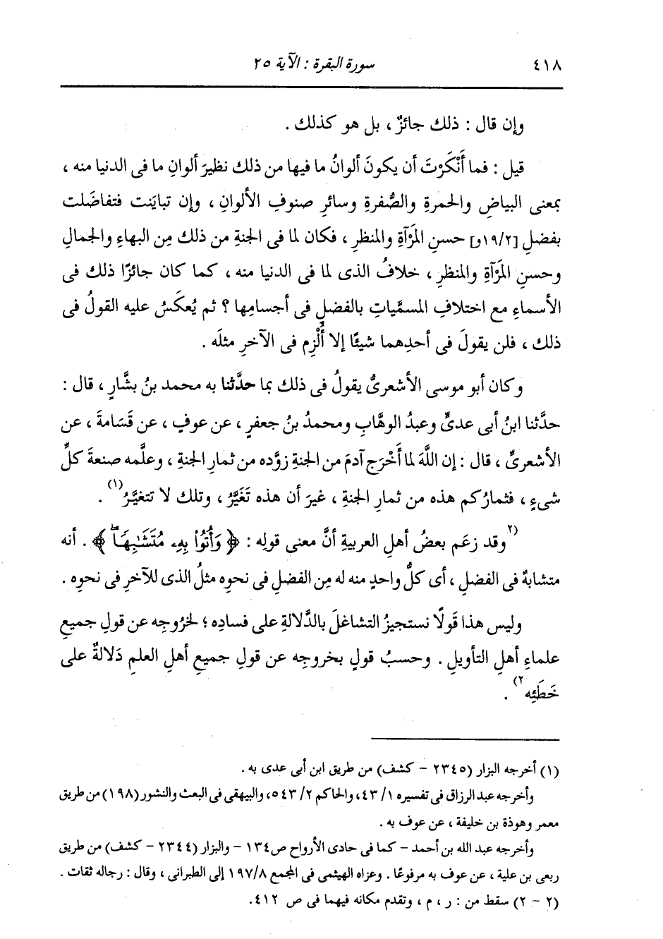 وَكَانَ أَبُو مُوسَى الْأَشْعَرِيُّ يَقُولُ فِي ذَلِكَ بِمَا حَدَّثَنِي بِهِ ابْنُ بَشَّارٍ، قَالَ: حَدَّثَنَا ابْنُ أَبِي عَدِيٍّ، وَعَبْدُ الْوَهَّابِ، وَمُحَمَّدُ بْنُ جَعْفَرٍ، عَنْ عَوْفٍ، عَنْ قَسَامَةَ، عَنِ الْأَشْعَرِيِّ، قَالَ: «§إِنَّ اللَّهَ لَمَّا أَخْرَجَ آدَمَ مِنَ الْجَنَّةِ زَوَّدَهُ مِنْ ثِمَارِ الْجَنَّةِ، وَعَلَّمَهُ صَنْعَةَ كُلِّ شَيْءٍ، فَثِمَارُكُمْ هَذِهِ مِنْ ثِمَارِ الْجَنَّةِ، غَيْرَ أَنَّ هَذِهِ تَغَيَّرُ وَتِلْكَ لَا تَغَيَّرُ» وَقَدْ زَعَمَ بَعْضُ أَهْلِ الْعَرَبِيَّةِ أَنَّ مَعْنَى قَوْلِهِ: {وَأُتُوا بِهِ مُتَشَابِهًا} [البقرة: 25] أَنَّهُ مُتَشَابِهٌ فِي الْفَضْلِ: أَيْ كُلُّ وَاحِدٍ مِنْهُ لَهُ مِنَ الْفَضْلِ فِي نَحْوِهِ مِثْلُ الَّذِي لِلْآخَرِ فِي نَحْوِهِ.: قَالَ أَبُو جَعْفَرٍ: وَلَيْسَ هَذَا قَوْلًا نَسْتَجِيزُ التَّشَاغُلَ بِالدَّلَالَةِ عَلَى فَسَادِهِ لِخُرُوجِهِ عَنْ قَوْلِ جَمِيعِ عُلَمَاءِ أَهْلِ التَّأْوِيلِ، وَحَسْبُ قَوْلٍ بِخُرُوجِهِ عَنْ قَوْلِ أَهْلِ الْعِلْمِ دَلَالَةً عَلَى خَطَئِهِ