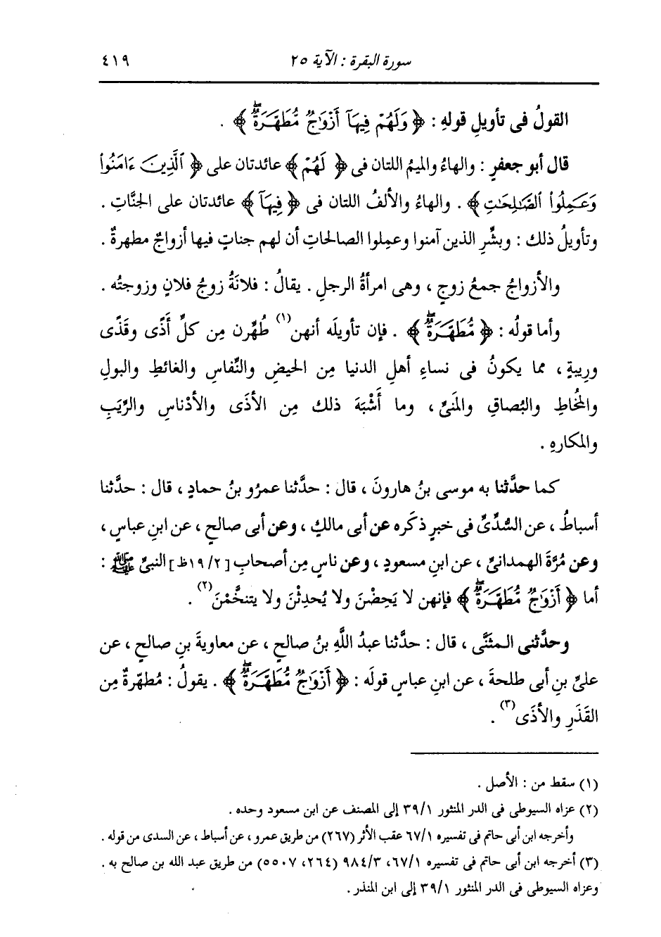 كَمَا حَدَّثَنَا بِهِ، مُوسَى بْنُ هَارُونَ، قَالَ: حَدَّثَنَا عَمْرُو بْنُ حَمَّادٍ، قَالَ: حَدَّثَنَا أَسْبَاطٌ، عَنِ السُّدِّيِّ، فِي خَبَرٍ ذَكَرَهُ عَنْ أَبِي مَالِكٍ، وَعَنْ أَبِي صَالِحٍ، عَنِ ابْنِ عَبَّاسٍ، وَعَنْ مُرَّةَ، عَنِ ابْنِ مَسْعُودٍ، وَعَنْ نَاسٍ، مِنْ أَصْحَابِ النَّبِيِّ صَلَّى اللهُ عَلَيْهِ وَسَلَّمَ: " §أَمَّا {أَزْوَاجٌ مُطَهَّرَةٌ} [البقرة: 25] فَإِنَّهُنَّ لَا يَحِضْنَ وَلَا يُحْدِثْنَ وَلَا يَتَنَخَّمْنَ "