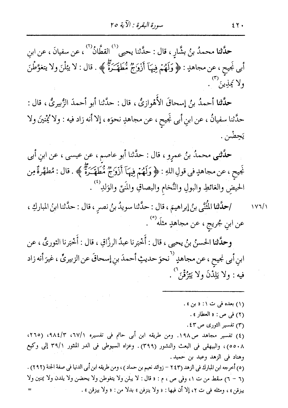 حَدَّثَنَا مُحَمَّدُ بْنُ بَشَّارٍ، قَالَ: حَدَّثَنَا يَحْيَى الْقَطَّانُ، عَنْ سُفْيَانَ، عَنِ ابْنِ أَبِي نَجِيحٍ، عَنْ مُجَاهِدٍ: " {§وَلَهُمْ فِيهَا أَزْوَاجٌ مُطَهَّرَةٌ} [البقرة: 25] قَالَ: لَا يَبُلْنَ وَلَا يَتَغَوَّطْنَ وَلَا يَمْذِينَ " وَحَدَّثَنَا أَحْمَدُ بْنُ إِسْحَاقَ الْأَهْوَازِيُّ، قَالَ: حَدَّثَنَا أَبُو أَحْمَدَ الزُّبَيْرِيُّ، قَالَ: حَدَّثَنَا سُفْيَانُ، عَنِ ابْنِ أَبِي نَجِيحٍ، عَنْ مُجَاهِدٍ، نَحْوَهُ، إِلَّا أَنَّهُ زَادَ فِيهِ: «وَلَا يَمْنِينَ وَلَا يَحِضْنَ»