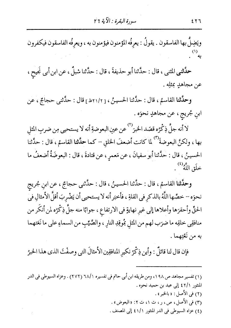 وَحَدَّثَنَا الْقَاسِمُ، قَالَ: حَدَّثَنَا الْحُسَيْنُ، قَالَ: حَدَّثَنِي حَجَّاجٌ، عَنِ ابْنِ جُرَيْجٍ بِنَحْوِهِ: «§خَصَّهَا اللَّهُ بِالذِّكْرِ فِي الْقِلَّةِ، فَأَخْبَرَ أَنَّهُ، لَا يَسْتَحْيِي أَنْ يَضْرِبَ، أَقَلَّ الْأَمْثَالِ فِي الْحَقِّ وَأَحْقَرَهَا وَأَعْلَاهَا إِلَى غَيْرِ نِهَايَةٍ فِي الِارْتِفَاعِ جَوَابًا مِنْهُ جَلَّ ذِكْرُهُ لِمَنْ أَنْكَرَ مِنْ مُنَافِقِي خَلْقِهِ مَا ضَرَبَ لَهُمْ مِنَ الْمَثَلِ بِمُوقِدِ النَّارِ وَالصَّيِّبِ مِنَ السَّمَاءِ عَلَى مَا نَعَتَهُمَا بِهِ مِنْ نِعَتِهِمَا» فَإِنْ قَالَ لَنَا قَائِلٌ: وَأَيْنَ ذِكْرُ نَكِيرِ الْمُنَافِقِينَ الْأَمْثَالَ الَّتِي وَصَفْتَ الَّذِي هَذَا الْخَبَرُ -[427]- جَوَابُهُ، فَنَعْلَمُ أَنَّ الْقَوْلَ فِي ذَلِكَ مَا قُلْتَ؟ قِيلَ: الدَّلَالَةُ عَلَى ذَلِكَ بَيَّنَهَا جَلَّ ذِكْرُهُ فِي قَوْلِهِ: {فَأَمَّا الَّذِينَ آمَنُوا فَيَعْلَمُونَ أَنَّهُ الْحَقُّ مِنْ رَبِّهِمْ وَأَمَّا الَّذِينَ كَفَرُوا فَيَقُولُونَ مَاذَا أَرَادَ اللَّهُ بِهَذَا مَثَلًا} [البقرة: 26] وَإِنَّ الْقَوْمَ الَّذِينَ ضَرَبَ لَهُمُ الْأَمْثَالَ فِي الْآيَتَيْنِ الْمُقَدَّمَتَيْنِ، اللَّتَيْنِ مَثَّلَ مَا عَلَيْهِ الْمُنَافِقُونَ مُقِيمُونَ فِيهِمَا بِمُوقِدِ النَّارِ وَبِالصَّيِّبِ مِنَ السَّمَاءِ عَلَى مَا وَصَفَ مِنْ ذَلِكَ قَبْلَ قَوْلِهِ {إِنَّ اللَّهَ لَا يَسْتَحْيِي أَنْ يَضْرِبَ مَثَلًا} [البقرة: 26] قَدْ أَنْكَرُوا الْمَثَلَ وَقَالُوا: {مَاذَا أَرَادَ اللَّهُ بِهَذَا مَثَلًا} [البقرة: 26] فَأَوْضَحَ خَطَأَ قِيلِهِمْ ذَلِكَ، وَقَبَّحَ لَهُمْ مَا نَطَقُوا بِهِ وَأَخْبَرَهُمْ بِحُكْمِهِمْ فِي قِيلِهِمْ مَا قَالُوا مِنْهُ، وَأَنَّهُ ضَلَالٌ وَفُسُوقٌ، وَأَنَّ الصَّوَابَ وَالْهُدَى مَا قَالَهُ الْمُؤْمِنُونَ دُونَ مَا قَالُوهُ