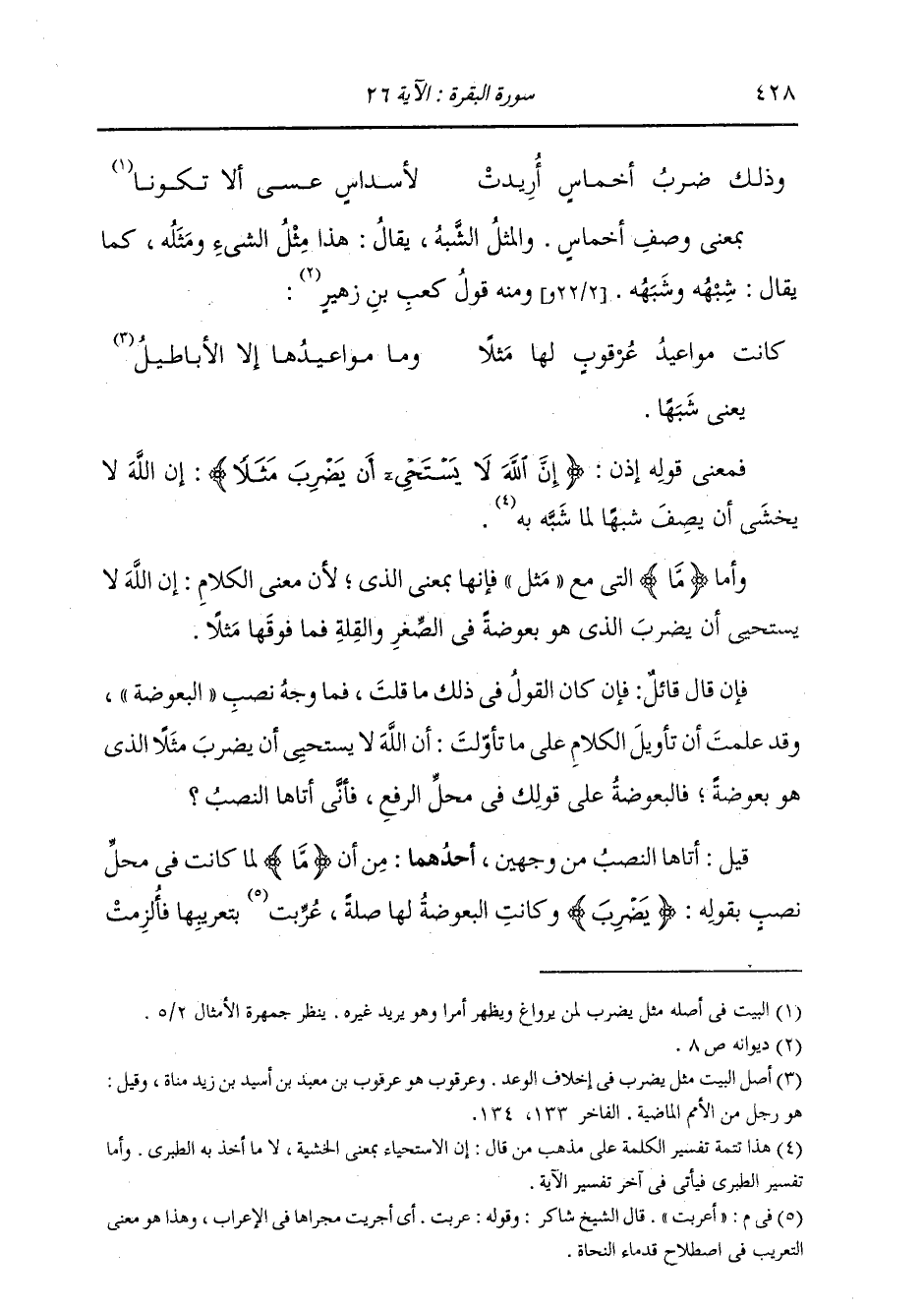 يَعْنِي شَبَهًا. فَمَعْنَى قَوْلِهِ إِذًا: {إِنَّ اللَّهَ لَا يَسْتَحْيِي أَنْ يَضْرِبَ مَثَلًا} [البقرة: 26] إِنَّ اللَّهَ لَا يَخْشَى أَنْ يَصِفَ شَبَهًا لِمَا شُبِّهَ بِهِ؛ وَأَمَّا مَا الَّتِي مَعَ مَثَلٍ فَإِنَّهَا بِمَعْنَى الَّذِي، لِأَنَّ مَعْنَى الْكَلَامِ: إِنَّ اللَّهَ لَا يَسْتَحْيِي أَنْ يَضْرِبَ الَّذِي هُوَ بَعُوضَةٌ فِي الصِّغَرِ وَالْقِلَّةِ فَمَا فَوْقَهَا مَثَلًا. فَإِنْ قَالَ لَنَا قَائِلٌ: فَإِنْ كَانَ الْقَوْلُ فِي ذَلِكَ كَمَا قُلْتَ فَمَا وَجْهُ نَصْبِ الْبَعُوضَةِ، وَقَدْ عَلِمْتَ أَنَّ تَأْوِيلَ الْكَلَامِ عَلَى مَا تَأَوَّلْتَ: {إِنَّ اللَّهَ لَا يَسْتَحْيِي أَنْ يَضْرِبَ مَثَلًا} [البقرة: 26] الَّذِي هُوَ بَعُوضَةٌ، فَالْبَعُوضَةُ عَلَى قَوْلِكَ فِي مَحَلِّ الرَّفْعِ، فَأَنَّى أَتَاهَا النَّصْبُ؟ قِيلَ: أَتَاهَا النَّصْبُ مِنْ وَجْهَيْنِ: أَحَدُهُمَا أَنَّ مَا لَمَّا كَانَتْ فِي مَحَلِّ نَصْبٍ بِقَوْلِهِ: {يَضْرِبُ} [البقرة: 26] وَكَانَتِ الْبَعُوضَةُ لَهَا صِلَةً أُعْرِبَتْ بِتَعْرِيبِهَا فَأُلْزِمَتْ