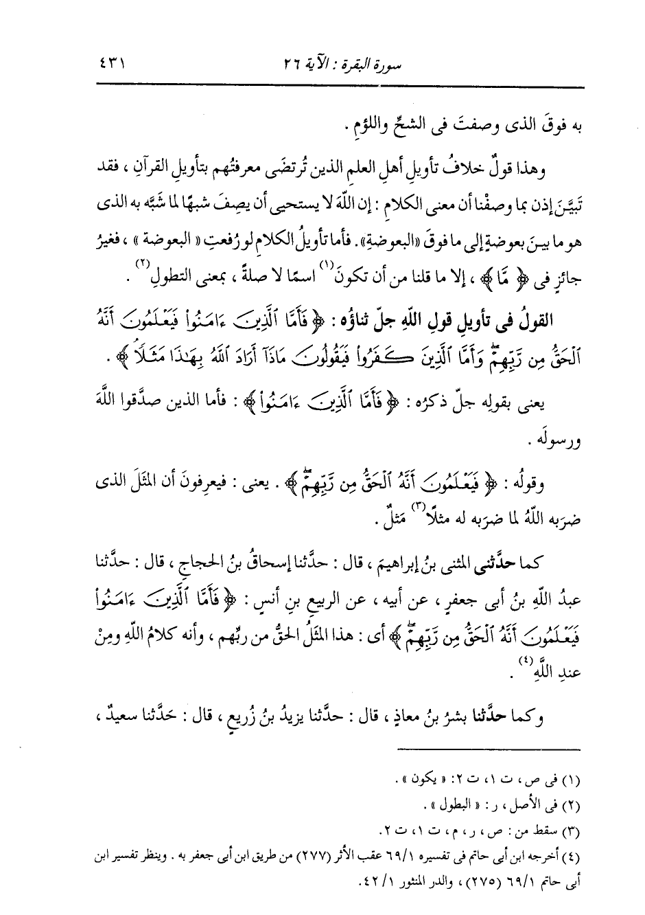 كَمَا حَدَّثَنِي بِهِ الْمُثَنَّى، قَالَ: حَدَّثَنَا إِسْحَاقُ بْنُ الْحَجَّاجِ، قَالَ: حَدَّثَنَا عَبْدُ اللَّهِ بْنُ أَبِي جَعْفَرٍ، عَنْ أَبِيهِ، عَنِ الرَّبِيعِ بْنِ أَنَسٍ: " {§فَأَمَّا الَّذِينَ آمَنُوا فَيَعْلَمُونَ أَنَّهُ الْحَقُّ مِنْ رَبِّهِمْ} [البقرة: 26] أَنَّ هَذَا الْمَثَلَ الْحَقُّ مِنْ رَبِّهِمْ أَنَّهُ كَلَامُ اللَّهِ وَمِنْ عِنْدِهِ "