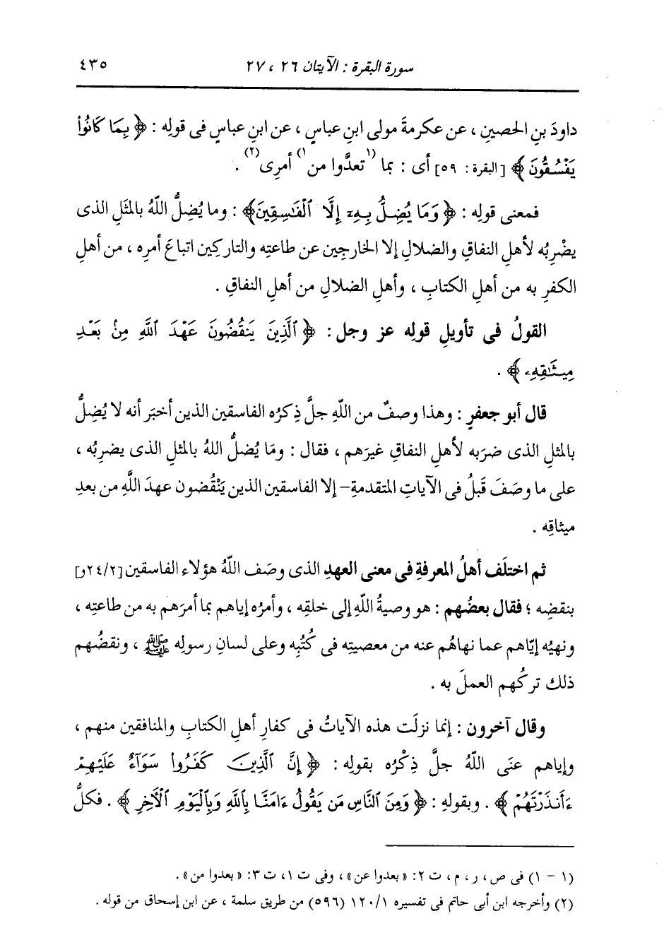 §الْقَوْلُ فِي تَأْوِيلِ قَوْلِهِ تَعَالَى: {الَّذِينَ يَنْقُضُونَ عَهْدَ اللَّهِ مِنْ بَعْدِ مِيثَاقِهِ وَيَقْطَعُونَ مَا أَمَرَ اللهُ بِهِ أَنْ يُوصَلَ وَيُفْسِدُونَ فِي الْأَرْضِ أُولَئِكَ هُمُ الْخَاسِرُونَ} [البقرة: 27] قَالَ أَبُو جَعْفَرٍ: وَهَذَا وَصْفٌ مِنَ اللَّهِ جَلَّ ذِكْرُهُ الْفَاسِقِينَ الَّذِينَ أَخْبَرَ أَنَّهُ لَا يُضِلُّ بِالْمَثَلِ الَّذِي ضَرَبَهُ لِأَهْلِ النِّفَاقِ غَيْرَهُمْ، فَقَالَ: {وَمَا يُضِلُّ} [البقرة: 26] اللَّهُ بِالْمَثَلِ الَّذِي يَضْرِبُهُ عَلَى مَا وَصَفَ قَبْلُ فِي الْآيَاتِ الْمُتَقَدِّمَةِ إِلَّا الْفَاسِقِينَ الَّذِينَ يَنْقُضُونَ عَهْدَ اللَّهِ مِنْ بَعْدِ مِيثَاقِهِ. ثُمَّ اخْتَلَفَ أَهْلُ الْمَعْرِفَةِ فِي مَعْنَى الْعَهْدِ الَّذِي وَصَفَ اللَّهُ هَؤُلَاءِ الْفَاسِقِينَ بِنَقْضِهِ، فَقَالَ بَعْضُهُمْ: هُوَ وَصِيَّةُ اللَّهِ إِلَى خَلْقِهِ، وَأَمْرُهُ إِيَّاهُمْ بِمَا أَمَرَهُمْ بِهِ مِنْ طَاعَتِهِ، وَنَهْيُهُ إِيَّاهُمْ عَمَّا نَهَاهُمْ عَنْهُ مِنْ مَعْصِيَتِهِ فِي كُتُبِهِ وَعَلَى لِسَانِ رَسُولِهِ صَلَّى اللهُ عَلَيْهِ وَسَلَّمَ، وَنَقْضُهُمْ ذَلِكَ تَرْكُهُمُ الْعَمَلَ بِهِ. وَقَالَ آخَرُونَ: إِنَّمَا نَزَلَتْ هَذِهِ الْآيَاتُ فِي كُفَّارِ أَهْلِ الْكِتَابِ وَالْمُنَافِقِينَ مِنْهُمْ، وَإِيَّاهُمْ عَنَى اللَّهُ جَلَّ ذِكْرُهُ بِقَوْلِهِ {إِنَّ الَّذِينَ كَفَرُوا سَوَاءٌ عَلَيْهِمْ أَأَنْذَرْتَهُمْ} [البقرة: 6] وَبِقَوْلِهِ: {وَمِنَ النَّاسِ مَنْ يَقُولُ آمَنَّا بِاللَّهِ وَبِالْيَوْمِ الْآخِرِ} [البقرة: 8] فَكُلُّ