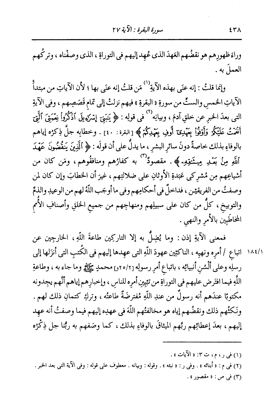 وَرَاءَ ظُهُورِهِمْ: هُوَ نَقْضُهُمُ الْعَهْدَ الَّذِي عَهِدَ إِلَيْهِمْ فِي التَّوْرَاةِ الَّذِي وَصَفْنَاهُ، وَتَرْكُهُمُ الْعَمَلَ بِهِ. وَإِنَّمَا قُلْتُ: إِنَّهُ عَنَى بِهَذِهِ الْآيَاتِ مَنْ قُلْتُ إِنَّهُ عَنَى بِهَا، لِأَنَّ الْآيَاتِ مِنَ ابْتِدَاءِ الْآيَاتِ الْخَمْسِ وَالسِّتِّ مِنْ سُورَةِ الْبَقَرَةِ فِيهِمْ نَزَلَتْ إِلَى تَمَامِ قَصَصِهِمْ، وَفِي الْآيَةِ الَّتِي بَعْدَ الْخَبَرِ عَنْ خَلْقِ آدَمَ وَبَيَانِهِ فِي قَوْلِهِ: {يَا بَنِي إِسْرَائِيلَ اذْكُرُوا نِعْمَتِيَ الَّتِي أَنْعَمْتُ عَلَيْكُمْ وَأَوْفُوا بِعَهْدِي أَوْفِ بِعَهْدِكُمْ} [البقرة: 40] وَخِطَابِهِ إِيَّاهُمْ جَلَّ ذِكْرُهُ بِالْوَفَاءِ فِي ذَلِكَ خَاصَّةً دُونَ سَائِرِ الْبَشَرِ مَا يَدُلُّ عَلَى أَنَّ قَوْلَهُ: {الَّذِينَ يَنْقُضُونَ عَهْدَ اللَّهِ مِنْ بَعْدِ مِيثَاقِهِ} [البقرة: 27] مَقْصُودٌ بِهِ كُفَّارُهُمْ وَمُنَافِقُوهُمْ، وَمَنْ كَانَ مِنْ أَشْيَاعِهِمْ مِنْ مُشْرِكِي عَبَدَةِ الْأَوْثَانِ عَلَى ضَلَالِهِمْ. غَيْرَ أَنَّ الْخِطَابَ وَإِنْ كَانَ لِمَنْ وَصَفْتُ مِنَ الْفَرِيقَيْنِ فَدَاخِلٌ فِي أَحْكَامِهِمْ وَفِيمَا أَوْجَبَ اللَّهُ لَهُمْ مِنَ الْوَعِيدِ وَالذَّمِّ وَالتَّوْبِيخِ كُلُّ مَنْ كَانَ عَلَى سَبِيلِهِمْ وَمِنْهَاجِهِمْ مِنْ جَمِيعِ الْخَلْقِ وَأَصْنَافِ الْأُمَمِ الْمُخَاطَبِينَ بِالْأَمْرِ وَالنَّهْيِ فَمَعْنَى الْآيَةِ إِذًا: وَمَا يُضِلُّ بِهِ إِلَّا التَّارِكِينَ طَاعَةَ اللَّهِ، الْخَارِجِينَ عَنِ اتِّبَاعِ أَمْرِهِ وَنَهْيِهِ النَّاكِثِينَ عُهُودَ اللَّهِ الَّتِي عَهِدَهَا إِلَيْهِمْ فِي الْكُتُبِ الَّتِي أَنْزَلَهَا إِلَى رُسُلِهِ وَعَلَى أَلْسُنِ أَنْبِيَائِهِ بِاتِّبَاعِ أَمْرِ رَسُولِهِ مُحَمَّدٍ صَلَّى اللهُ عَلَيْهِ وَسَلَّمَ وَمَا جَاءَ بِهِ وَطَاعَةِ اللَّهِ فِيمَا افْتَرَضَ عَلَيْهِمْ فِي التَّوْرَاةِ مِنْ تَبْيِينِ أَمْرِهِ لِلنَّاسِ، وَإِخْبَارِهِمْ إِيَّاهُمْ أَنَّهُمْ يَجِدُونَهُ مَكْتُوبًا عِنْدَهُمْ أَنَّهُ رَسُولٌ مِنْ عِنْدِ اللَّهِ مُفْتَرَضَةٌ طَاعَتُهُ. وَتَرْكِ كِتْمَانِ ذَلِكَ لَهُمْ وَنَكْثِهِمْ ذَلِكَ، وَنَقْضُهُمْ إِيَّاهُ هُوَ مُخَالَفَتُهُمُ اللَّهَ فِي عَهْدِهِ إِلَيْهِمْ فِيمَا وَصَفْتُ أَنَّهُ عَهِدَ إِلَيْهِمْ بَعْدَ إِعْطَائِهِمْ رَبَّهُمُ الْمِيثَاقَ بِالْوَفَاءِ بِذَلِكَ كَمَا وَصَفَهُمْ بِهِ جَلَّ ذِكْرُهُ