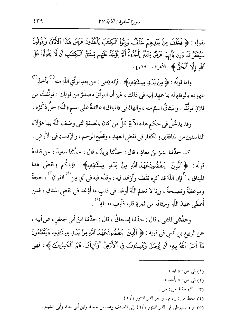 كَمَا حَدَّثَنَا بِشْرُ بْنُ مُعَاذٍ، قَالَ: حَدَّثَنَا يَزِيدُ، عَنْ سَعِيدٍ، عَنْ قَتَادَةَ: " قَوْلُهُ: {§الَّذِينَ يَنْقُضُونَ عَهْدَ اللَّهِ مِنْ بَعْدِ مِيثَاقِهِ} [البقرة: 27] فَإِيَّاكُمْ وَنَقْضَ هَذَا الْمِيثَاقِ، فَإِنَّ اللَّهَ قَدْ كَرِهَ نَقْضَهُ وَأَوْعَدَ فِيهِ وَقَدَّمَ فِيهِ فِي آيِ الْقُرْآنِ حُجَّةً وَمَوْعِظَةً وَنَصِيحَةً، وَإِنَّا لَا نَعْلَمُ اللَّهَ جَلَّ ذِكْرُهُ أَوْعَدَ فِي ذَنْبٍ مَا أَوْعَدَ فِي نَقْضِ الْمِيثَاقِ، فَمَنْ أَعْطَى عَهْدَ اللَّهِ وَمِيثَاقَهُ مِنْ ثَمَرَةِ قَلْبِهِ فَلْيَفِ بِهِ لِلَّهِ "