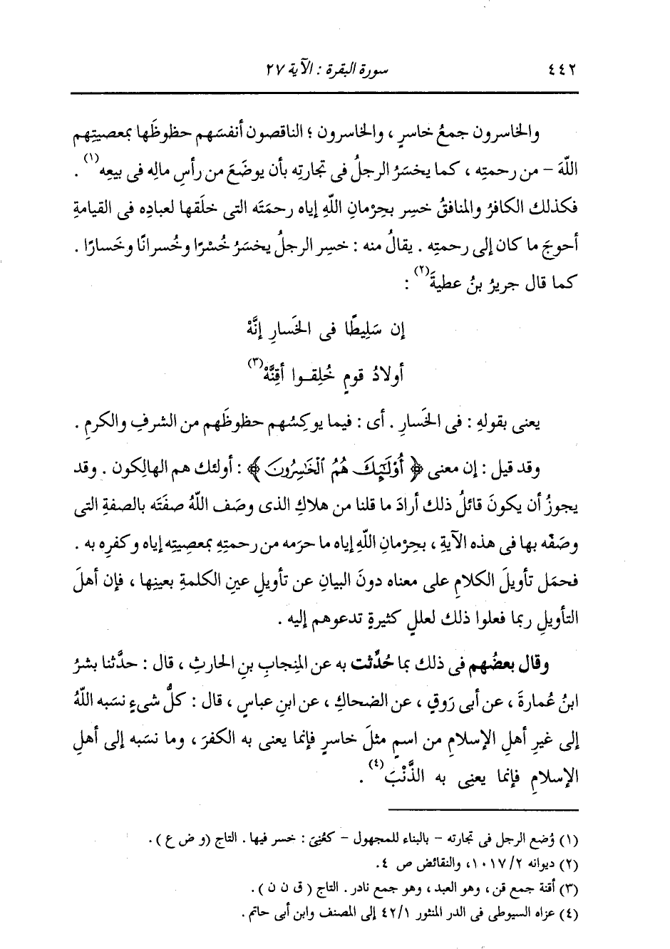 } [البقرة: 27] قَالَ أَبُو جَعْفَرٍ: وَالْخَاسِرُونَ جَمْعُ خَاسِرٍ، وَالْخَاسِرُونَ: النَّاقِصُونَ أَنْفُسَهُمْ حُظُوظَهَا بِمَعْصِيَتِهِمُ اللَّهَ مِنْ رَحْمَتِهِ، كَمَا يَخْسَرُ الرَّجُلُ فِي تِجَارَتِهِ بِأَنْ يُوضَعَ مِنْ رَأْسِ مَالِهِ فِي بَيْعِهِ. فَكَذَلِكَ الْكَافِرُ وَالْمُنَافِقُ خَسِرَ بِحِرْمَانِ اللَّهِ إِيَّاهُ رَحْمَتَهُ الَّتِي خَلَقَهَا لِعِبَادِهِ فِي الْقِيَامَةِ أَحْوَجَ مَا كَانَ إِلَى رَحْمَتِهِ، يُقَالُ مِنْهُ: خَسِرَ الرَّجُلُ يَخْسَرُ خَسْرًا وَخُسْرَانًا وَخَسَارًا، كَمَا قَالَ جَرِيرُ بْنُ عَطِيَّةَ: