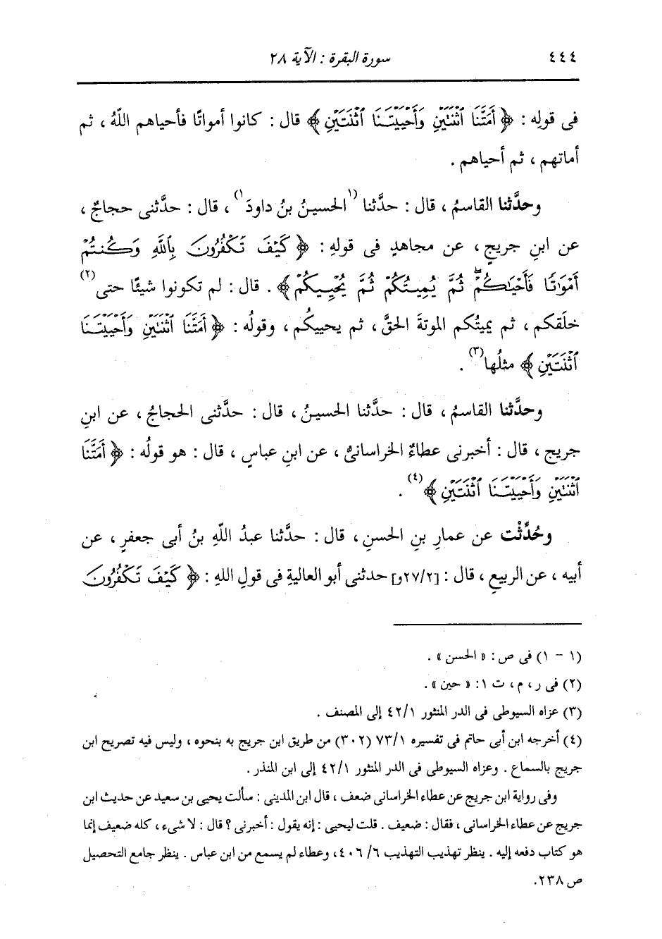 وَحَدَّثَنَا الْقَاسِمُ، قَالَ: حَدَّثَنَا الْحُسَيْنُ بْنُ دَاوُدَ، قَالَ: حَدَّثَنِي حَجَّاجٌ، عَنِ ابْنِ جُرَيْجٍ، عَنْ مُجَاهِدٍ: " فِي قَوْلِهِ: {كَيْفَ تَكْفُرُونَ بِاللَّهِ وَكُنْتُمْ أَمْوَاتًا فَأَحْيَاكُمْ ثُمَّ يُمِيتُكُمْ ثُمَّ يُحْيِيكُمْ} [البقرة: 28] قَالَ: §لَمْ تَكُونُوا شَيْئًا حِينَ خَلَقَكُمْ، ثُمَّ يُمِيتُكُمُ الْمَوْتَةَ الْحَقَّ، ثُمَّ يُحْيِيكُمْ. وَقَوْلُهُ: {أَمَتَّنَا اثْنَتَيْنِ وَأَحْيَيْتَنَا اثْنَتَيْنِ} [غافر: 11] مِثْلُهَا "