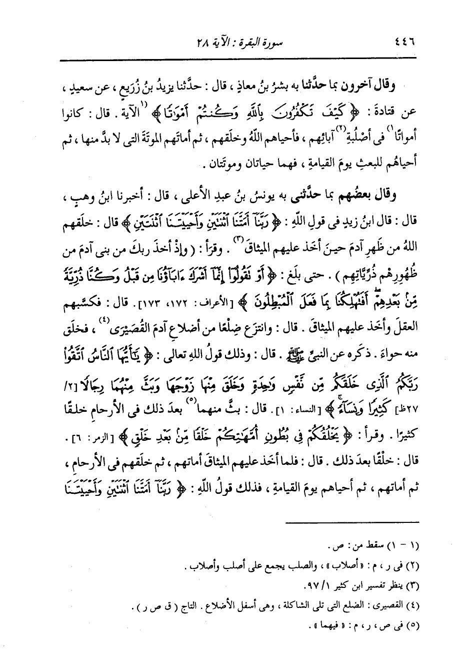 وَقَالَ آخَرُونَ بِمَا حَدَّثَنَا بِهِ، بِشْرُ بْنُ مُعَاذٍ قَالَ: حَدَّثَنَا يَزِيدُ بْنُ زُرَيْعٍ، عَنْ سَعِيدٍ، عَنْ قَتَادَةَ: " قَوْلُهُ: {§كَيْفَ تَكْفُرُونَ بِاللَّهِ وَكُنْتُمْ أَمْوَاتًا} [البقرة: 28] الْآيَةُ. قَالَ: كَانُوا أَمْوَاتًا فِي أَصْلَابِ آبَائِهِمْ، فَأَحْيَاهُمُ اللَّهُ وَخَلَقَهُمْ، ثُمَّ أَمَاتَهُمُ الْمَوْتَةَ الَّتِي لَا بُدَّ مِنْهَا، ثُمَّ أَحْيَاهُمْ لِلْبَعْثِ يَوْمَ الْقِيَامَةِ؛ فَهُمَا حَيَاتَانِ وَمَوْتَتَانِ "