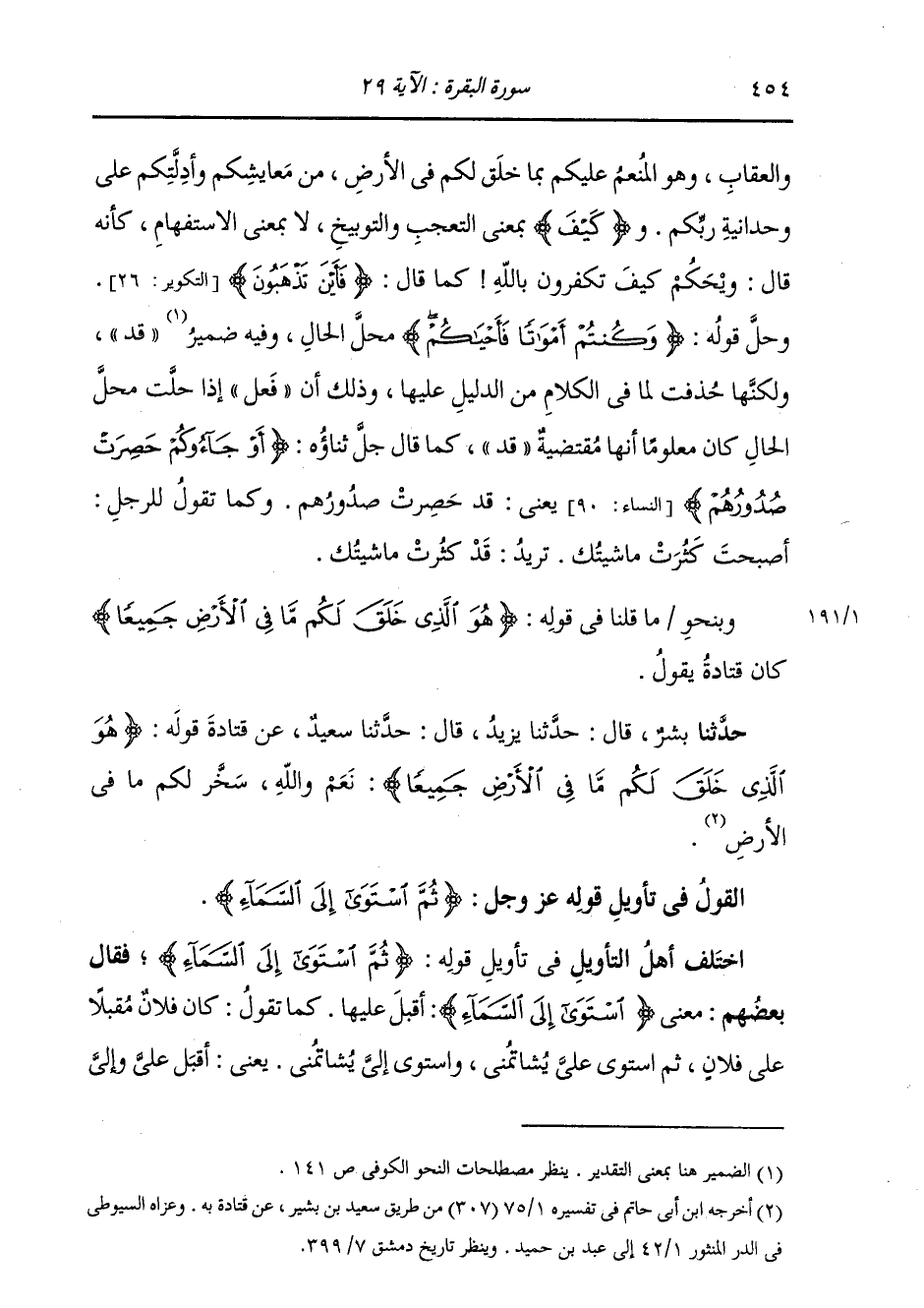 §الْقَوْلُ فِي تَأْوِيلِ قَوْلِهِ تَعَالَى: {ثُمَّ اسْتَوَى إِلَى السَّمَاءِ فَسَوَّاهُنَّ سَبْعَ سَمَوَاتٍ} قَالَ أَبُو جَعْفَرٍ: اخْتُلِفَ فِي تَأْوِيلِ قَوْلِهِ: {ثُمَّ اسْتَوَى إِلَى السَّمَاءِ} [البقرة: 29] فَقَالَ بَعْضُهُمْ: مَعْنَى اسْتَوَى إِلَى السَّمَاءِ، أَقْبَلَ عَلَيْهَا، كَمَا تَقُولُ: كَانَ فُلَانٌ مُقْبِلًا عَلَى فُلَانٍ ثُمَّ اسْتَوَى عَلَيَّ يُشَاتِمُنِي وَاسْتَوَى إِلَيَّ يُشَاتِمُنِي، بِمَعْنَى: أَقْبَلَ عَلَيَّ وَإِلَيَّ