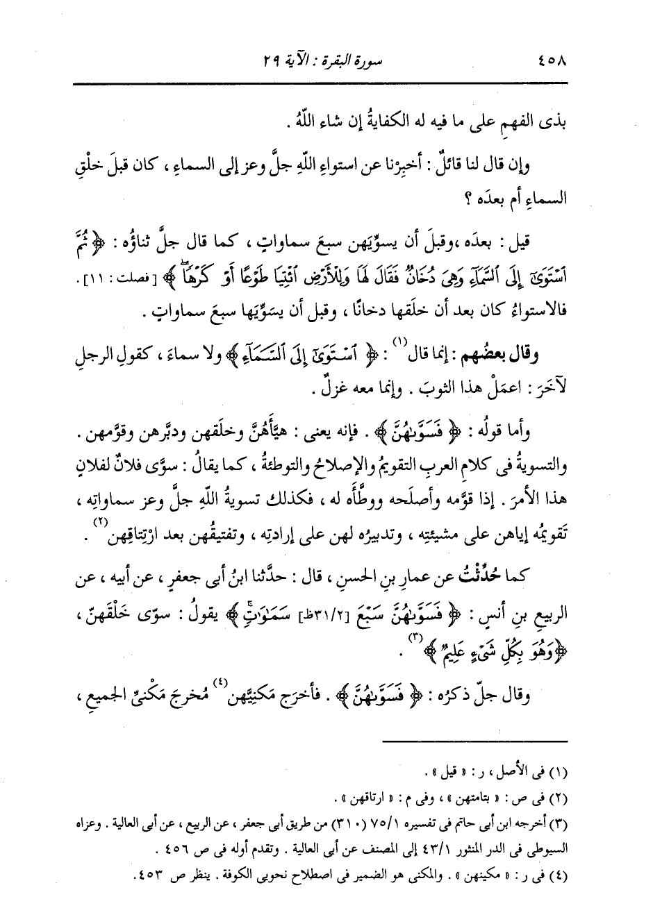 كَمَا حُدِّثْتُ عَنْ عَمَّارٍ، قَالَ: حَدَّثَنَا ابْنُ أَبِي جَعْفَرٍ، عَنْ أَبِيهِ، عَنِ الرَّبِيعِ بْنِ أَنَسٍ: " {§فَسَوَّاهُنَّ سَبْعَ سَمَوَاتٍ} يَقُولُ: سَوَّى خَلْقَهُنَّ وَهُوَ بِكُلِّ شَيْءٍ عَلِيمٌ " وَقَالَ جَلَّ ذِكْرُهُ: {فَسَوَّاهُنَّ} [البقرة: 29] فَأَخْرَجَ مَكْنِيَّهُنَّ مَخْرَجَ مَكْنِيِّ الْجَمْعِ.