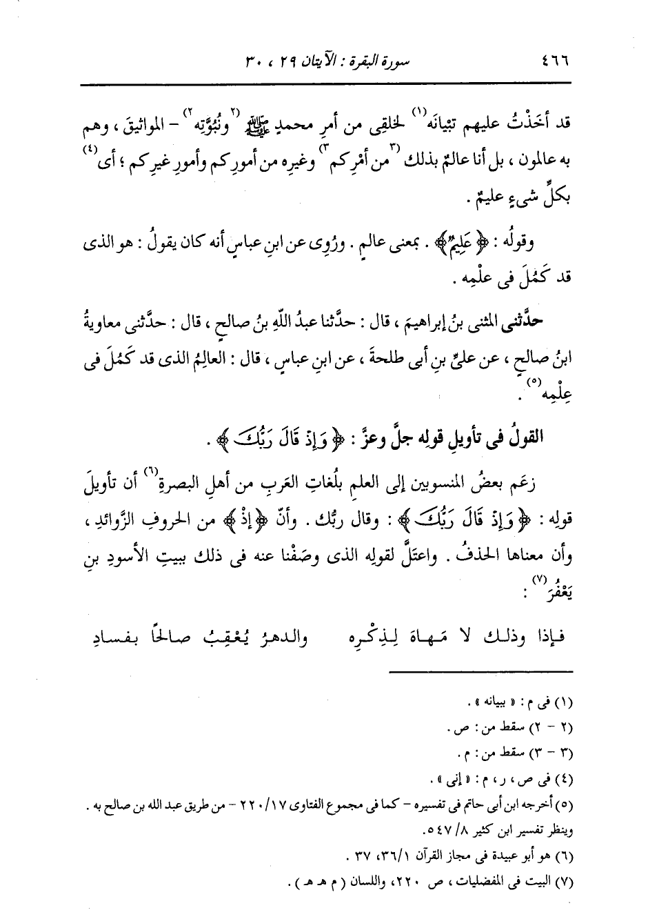 §الْقَوْلُ فِي تَأْوِيلِ قَوْلِهِ تَعَالَى: {وَإِذْ قَالَ رَبُّكَ لِلْمَلَائِكَةِ إِنِّي جَاعِلٌ فِي الْأَرْضِ خَلِيفَةً قَالُوا أَتَجْعَلُ فِيهَا مَنْ يُفْسِدُ فِيهَا وَيَسْفِكُ الدِّمَاءَ وَنَحْنُ نُسَبِّحُ بِحَمْدِكَ وَنُقَدِّسُ لَكَ قَالَ إِنِّي أَعْلَمُ مَا لَا تَعْلَمُونَ} [البقرة: 30] قَالَ أَبُو جَعْفَرٍ: زَعَمَ بَعْضُ الْمَنْسُوبِينَ إِلَى الْعِلْمِ بِلُغَاتِ الْعَرَبِ مِنْ أَهْلِ الْبَصْرَةِ أَنَّ تَأْوِيلَ قَوْلِهِ: {وَإِذْ قَالَ رَبُّكَ} [البقرة: 30] وَقَالَ رَبُّكَ، وَأَنَّ إِذْ مِنَ الْحُرُوفِ الزَّوَائِدِ، وَأَنَّ مَعْنَاهَا الْحَذْفُ. وَاعْتَلَّ لِقَوْلِهِ الَّذِي وَصَفْنَا عَنْهُ فِي ذَلِكَ بِبَيْتِ الْأَسْوَدِ بْنِ يَعْفُرَ: