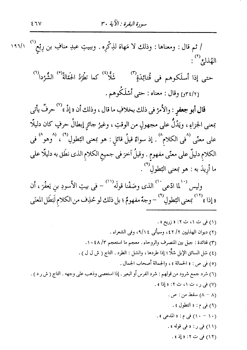 وَقَالَ: مَعْنَاهُ: حَتَّى أَسْلَكُوهُمْ. قَالَ أَبُو جَعْفَرٍ: وَالْأَمْرُ فِي ذَلِكَ بِخِلَافِ مَا قَالَ؛ وَذَلِكَ أَنَّ «إِذْ» حَرْفُ يَأْتِي بِمَعْنَى الْجَزَاءِ، وَيَدُلُّ عَلَى مَجْهُولٍ مِنَ الْوَقْتِ، وَغَيْرُ جَائِزٍ إِبْطَالُ حَرْفٍ كَانَ دَلِيلًا عَلَى مَعْنَى فِي الْكَلَامِ. إِذْ سَوَاءٌ قِيلُ قَائِلٍ هُوَ بِمَعْنَى التَّطَوُّلِ، وَهُوَ فِي الْكَلَامِ دَلِيلٌ عَلَى مَعْنَى مَفْهُومٍ. وَقِيلِ آخَرَ فِي جَمِيعِ الْكَلَامِ الَّذِي نَطَقَ بِهِ دَلِيلًا عَلَى مَا أُرِيدَ بِهِ وَهُوَ بِمَعْنَى التَّطَوُّلِ. وَلَيْسَ لِمُدَّعِي الَّذِي وَصَفْنَا قَوْلَهُ فِي بَيْتِ الْأَسْوَدِ بْنِ يَعْفُرَ، أَنَّ إِذَا بِمَعْنَى التَّطَوُّلِ وَجْهٌ مَفْهُومٌ؛ بَلْ ذَلِكَ لَوْ حُذِفَ مِنَ الْكَلَامِ لَبَطَلَ الْمَعْنَى