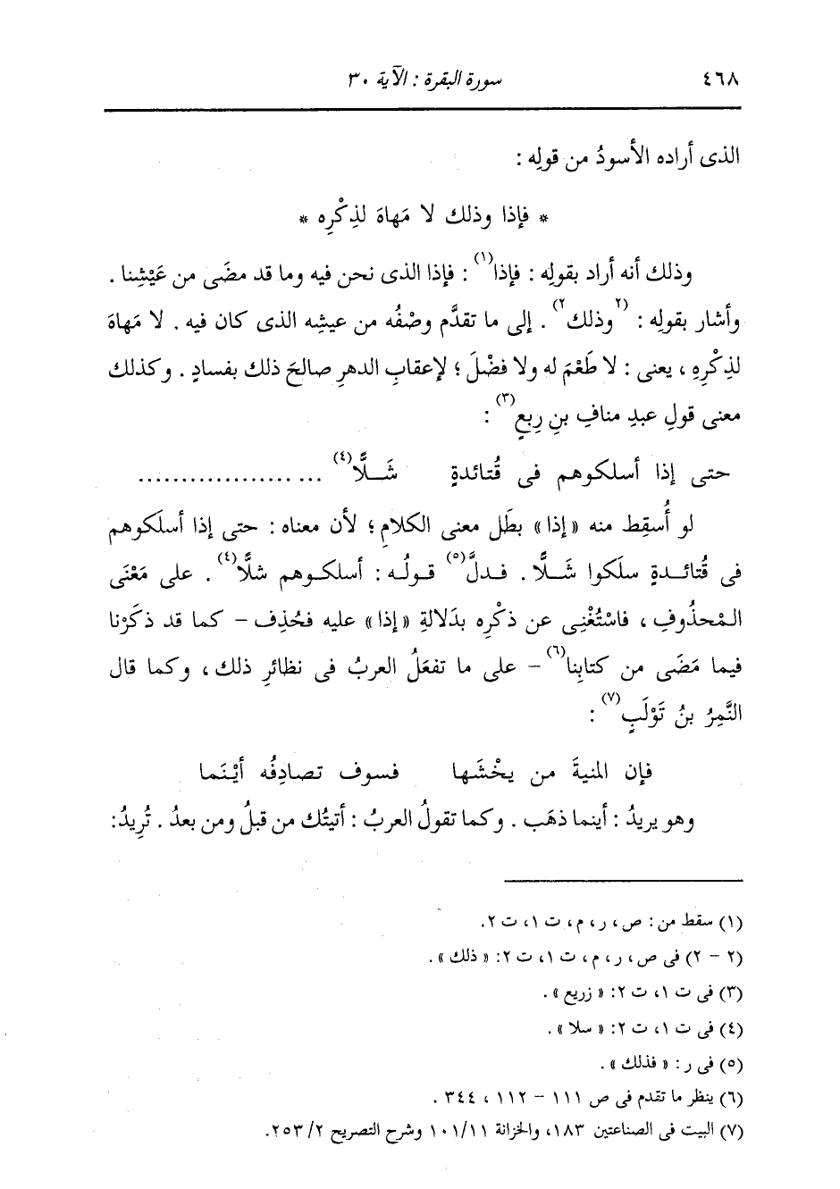 وَذَلِكَ أَنَّهُ أَرَادَ بِقَوْلِهِ: فَإِذَا الَّذِي نَحْنُ فِيهِ، وَمَا مَضَى مِنْ عَيْشِنَا. وَأَشَارَ بِقَوْلِهِ ذَلِكَ إِلَى مَا تَقَدَّمَ وَصْفُهُ مِنْ عَيْشِهِ الَّذِي كَانَ فِيهِ لَامَهَاهَ لِذِكْرِهِ، يَعْنِي لَا طَعْمَ لَهُ وَلَا فَضْلَ، لِإِعْقَابِ الدَّهْرِ صَالِحَ ذَلِكَ بِفَسَادٍ. وَكَذَلِكَ مَعْنَى قَوْلِ عَبْدِ مَنَافِ بْنِ رِبْعٍ: