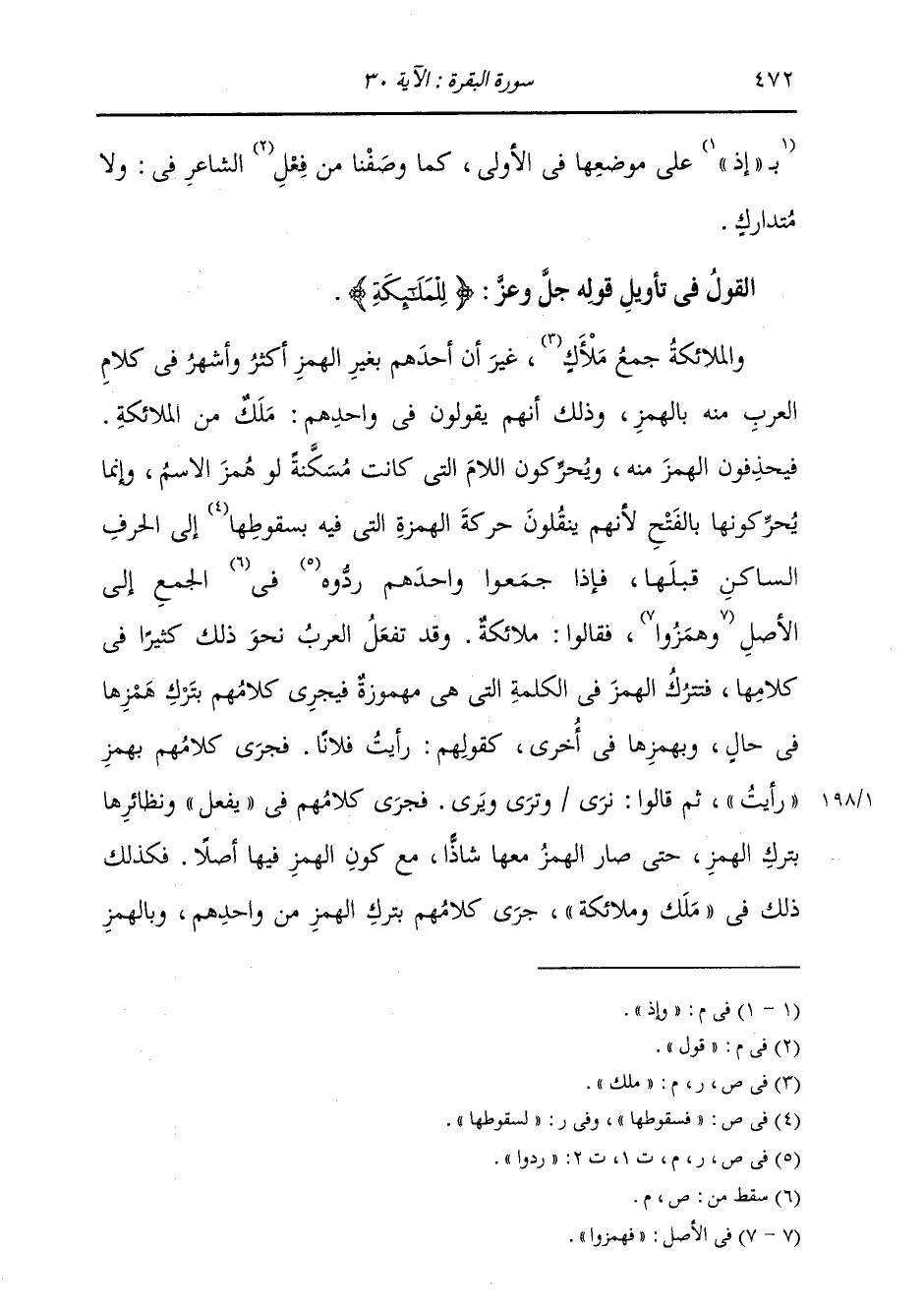§الْقَوْلُ فِي تَأْوِيلِ قَوْلِهِ تَعَالَى: {لِلْمَلَائِكَةِ} [البقرة: 30] قَالَ أَبُو جَعْفَرٍ: وَالْمَلَائِكَةُ جَمْعُ مَلَكٍ، غَيْرَ أَنَّ وَاحِدَهُمْ بِغَيْرِ الْهَمْزِ أَكْثَرُ وَأَشْهُرُ فِي كَلَامِ الْعَرَبِ مِنْهُ بِالْهَمْزِ، وَذَلِكَ أَنَّهُمْ يَقُولُونَ فِي وَاحِدِهِمْ مَلَكٌ مِنَ الْمَلَائِكَةِ، فَيَحْذِفُونَ الْهَمْزَ مِنْهُ، وَيُحَرِّكُونَ اللَّامَ الَّتِي كَانَتْ مُسَكَّنَةً لَوْ هُمِزَ الِاسْمُ. وَإِنَّمَا يُحَرِّكُونَهَا بِالْفَتْحِ، لِأَنَّهُمْ يَنْقُلُونَ حَرَكَةَ الْهَمْزَةِ الَّتِي فِيهِ بِسُقُوطِهَا إِلَى الْحَرْفِ السَّاكِنِ قَبْلَهَا، فَإِذَا جَمَعُوا وَاحِدَهُمْ رَدُّوا الْجَمْعَ إِلَى الْأَصْلِ وَهَمَزُوا، فَقَالُوا: مَلَائِكَةٌ. وَقَدْ تَفْعَلُ الْعَرَبُ نَحْوَ ذَلِكَ كَثِيرًا فِي كَلَامِهَا، فَتَتْرُكُ الْهَمْزَ فِي الْكَلِمَةِ الَّتِي هِيَ مَهْمُوزَةٌ فَيَجْرِي كَلَامُهُمْ بِتَرْكِ هَمْزِهَا فِي حَالٍ، وَبِهَمْزِهَا فِي أُخْرَى، كَقَوْلِهِمْ: رَأَيْتُ فُلَانًا، فَجَرَى كَلَامُهُمْ بِهَمْزِ رَأَيْتُ، ثُمَّ قَالُوا: نَرَى وَتَرَى وَيَرَى، فَجَرَى كَلَامُهُمْ فِي يَفْعَلُ وَنَظَائِرِهَا بِتَرْكِ الْهَمْزِ، حَتَّى صَارَ الْهَمْزُ مَعَهَا شَاذًّا مَعَ كَوْنِ الْهَمْزِ فِيهَا أَصْلًا. فَكَذَلِكَ ذَلِكَ فِي مَلَكٍ وَمَلَائِكَةٍ، جَرَى كَلَامُهُمْ بِتَرْكِ الْهَمْزِ مِنْ وَاحِدِهِمْ، وَبِالْهَمْزِ