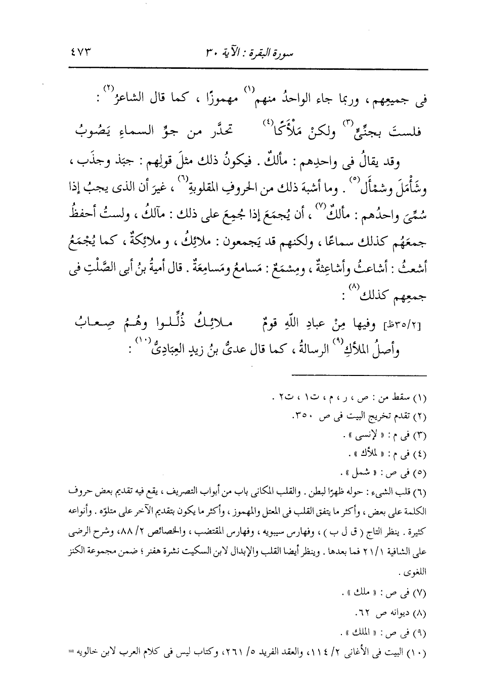وَقَدْ يُقَالُ فِي وَاحِدِهِمْ: مَأْلَكٌ، فَيَكُونُ ذَلِكَ مِثْلُ قَوْلِهِمْ: جَبَذَ وَجَذَبَ، وَشَأْمَلَ وَشَمْأَلَ، وَمَا أَشْبَهَ ذَلِكَ مِنَ الْحُرُوفِ الْمَقْلُوبَةِ. غَيْرَ أَنَّ الَّذِيَ يَجِبُ إِذَا سُمِّيَ وَاحِدُهُمْ مَأْلَكٌ، أَنْ يُجْمَعَ إِذْ جُمِعَ عَلَى ذَلِكَ: مَالِكٌ، وَلَسْتُ أَحْفَظُ جَمْعَهُمْ كَذَلِكَ سَمَاعًا، وَلَكِنَّهُمْ قَدْ يَجْمَعُونَ مَلَائِكَ وَمَلَائِكَةً، كَمَا يُجْمَعُ أَشْعَثُ: أَشَاعِثُ وَأَشَاعِثَةُ، وَمَسْمَعٌ: مَسَامِعٌ وَمَسَامِعَةٌ. قَالَ أُمَيَّةُ بْنُ أَبِي الصَّلْتِ فِي جَمْعِهِمْ كَذَلِكَ: