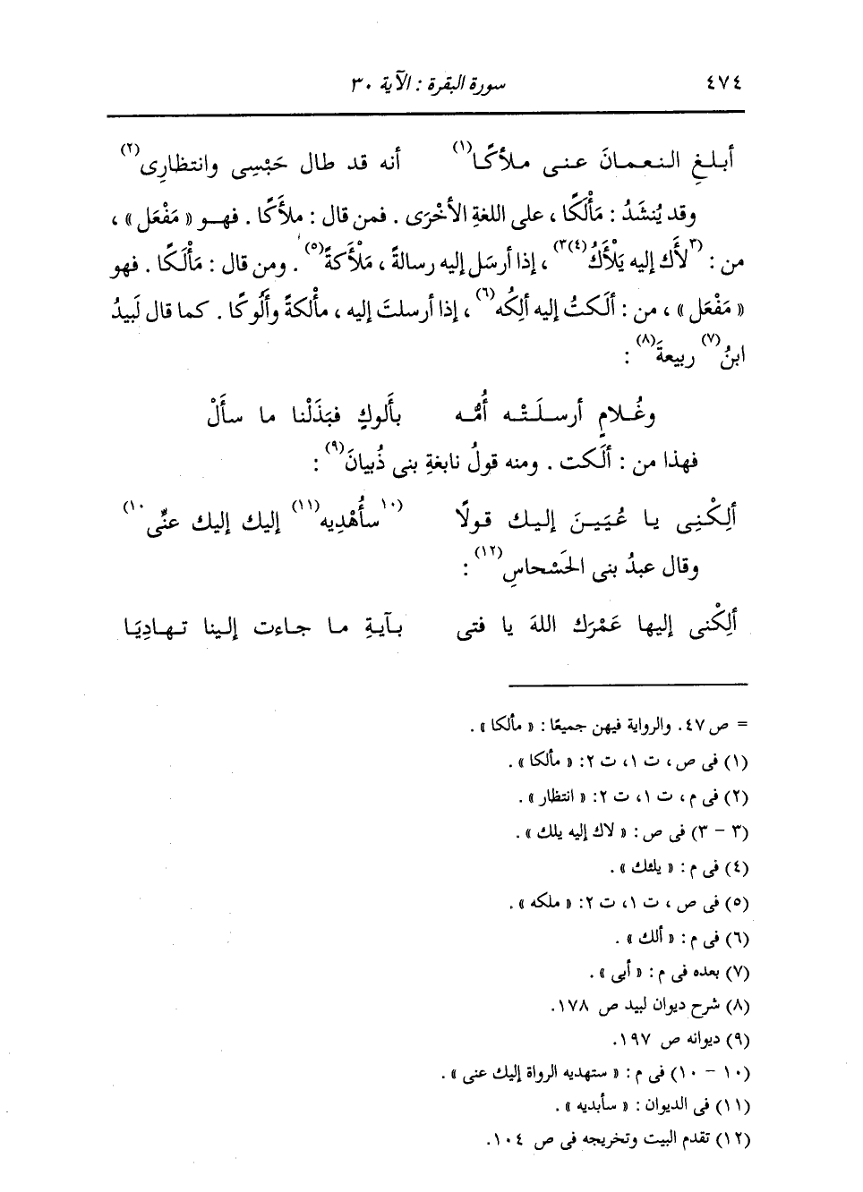 وَقَدْ يُنْشَدُ مَأْلَكًا عَلَى اللُّغَةِ الْأُخْرَى، فَمَنْ قَالَ: مَلْأَكًا، فَهُوَ مَفْعَلٌ مِنْ لَأَكَ إِلَيْهِ يَلْأَكُ: إِذَا أَرْسَلَ إِلَيْهِ رِسَالَةً مَلْأَكَةً. وَمَنْ قَالَ: مَأْلَكًا، فَهُوَ مَفْعَلٌ مِنْ أَلَكْتُ إِلَيْهِ آلِكُ: إِذَا أَرْسَلْتُ إِلَيْهِ مَأْلَكَةً وَأَلُوكًا، كَمَا قَالَ لَبِيدُ بْنُ رَبِيعَةَ:
