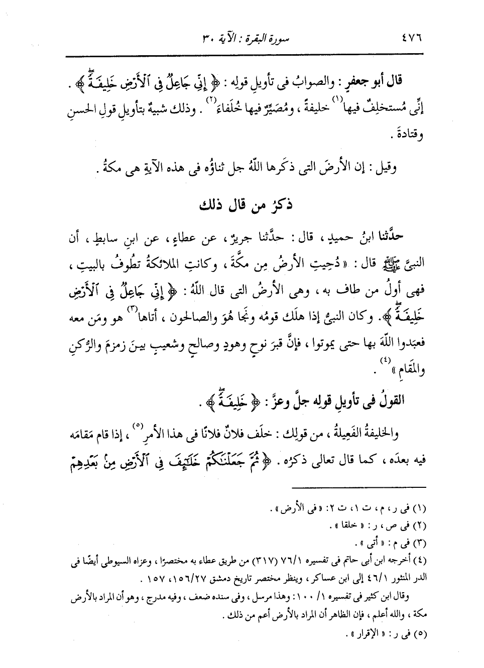 §الْقَوْلُ فِي تَأْوِيلِ قَوْلِهِ تَعَالَى: {خَلِيفَةً} [البقرة: 30] وَالْخَلِيفَةُ الْفَعِيلَةُ، مِنْ قَوْلِكَ: خَلَفَ فُلَانٌ فُلَانًا فِي هَذَا الْأَمْرِ إِذَا قَامَ مَقَامَهُ فِيهِ بَعْدَهُ كَمَا قَالَ جَلَّ ثَنَاؤُهُ: {ثُمَّ جَعَلْنَاكُمْ خَلَائِفَ فِي الْأَرْضِ مِنْ بَعْدِهِمْ -[477]- لَنَنْظُرَ كَيْفَ تَعْمَلُونَ} [يونس: 14] يَعْنِي بِذَلِكَ: أَنَّهُ أَبْدَلَكُمْ فِي الْأَرْضِ مِنْهُمْ فَجَعَلَكُمْ خُلَفَاءَ بَعْدَهُمْ وَمِنْ ذَلِكَ قِيلَ لِلسُّلْطَانِ الْأَعْظَمِ: خَلِيفَةً، لِأَنَّهُ خَلَفَ الَّذِي كَانَ قَبْلَهُ، فَقَامَ بِالْأَمْرِ مَقَامَهُ، فَكَانَ مِنْهُ خَلَفًا، يُقَالُ مِنْهُ: خَلَفَ الْخَلِيفَةُ يَخْلُفُ خِلَافَةً وَخَلِيفًا