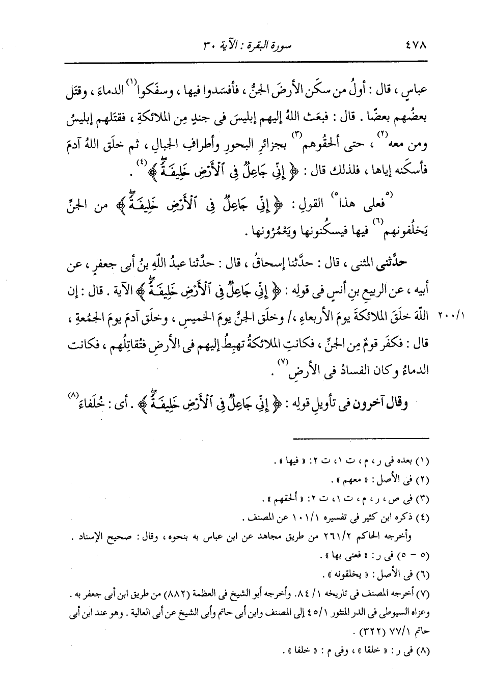 وَحَدَّثَنِي الْمُثَنَّى، قَالَ: حَدَّثَنَا إِسْحَاقُ، قَالَ: حَدَّثَنَا عَبْدُ اللَّهِ بْنُ أَبِي جَعْفَرٍ، عَنْ أَبِيهِ، عَنِ الرَّبِيعِ بْنِ أَنَسٍ: " فِي قَوْلِهِ: {إِنِّي جَاعِلٌ فِي الْأَرْضِ خَلِيفَةً} [البقرة: 30] الْآيَةُ، قَالَ: إِنَّ اللَّهَ §خَلَقَ الْمَلَائِكَةَ يَوْمَ الْأَرْبِعَاءِ، وَخَلَقَ الْجِنَّ يَوْمَ الْخَمِيسِ، وَخَلَقَ آدَمَ يَوْمَ الْجُمُعَةِ، فَكَفَرَ قَوْمٌ مِنَ الْجِنِّ، فَكَانَتِ الْمَلَائِكَةُ تَهْبِطُ إِلَيْهِمْ فِي الْأَرْضِ فَتُقَاتِلُهُمْ، فَكَانَتِ الدِّمَاءُ وَكَانَ الْفَسَادُ فِي الْأَرْضِ " وَقَالَ آخَرُونَ فِي تَأْوِيلِ قَوْلِهِ: {إِنِّي جَاعِلٌ فِي الْأَرْضِ خَلِيفَةً} [البقرة: 30] أَيْ خَلَفًا -[479]- يَخْلُفُ بَعْضُهُمْ بَعْضًا، وَهُمْ وَلَدُ آدَمَ الَّذِينَ يَخْلُفُونَ أَبَاهُمْ آدَمَ، وَيَخْلُفُ كُلُّ قَرْنٍ مِنْهُمُ الْقَرْنَ الَّذِي سَلَفَ قَبْلَهُ. وَهَذَا قَوْلُ حُكِيَ عَنِ الْحَسَنِ الْبَصْرِيِّ