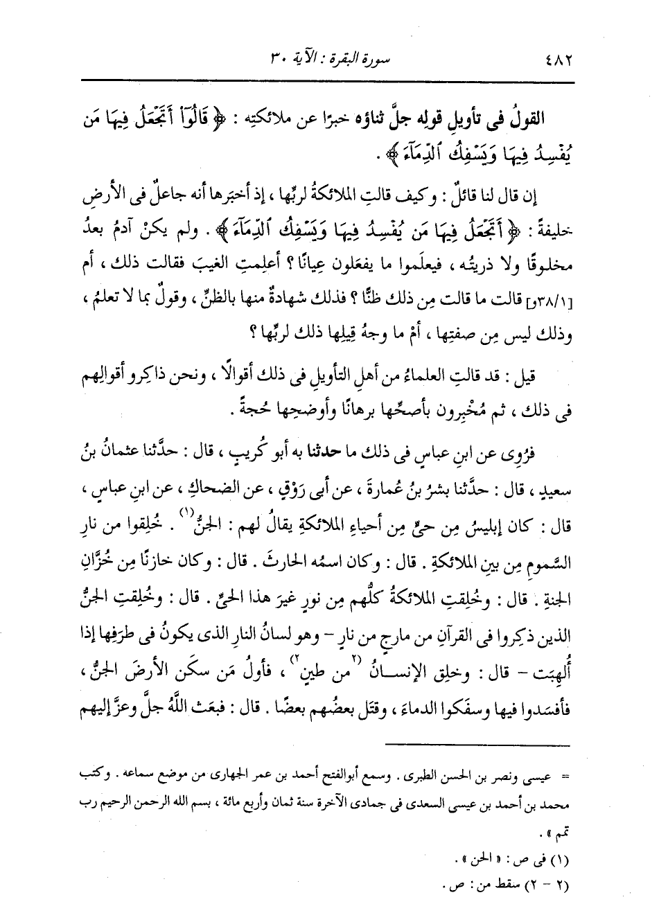 §الْقَوْلُ فِي تَأْوِيلِ قَوْلِهِ تَعَالَى: {قَالُوا أَتَجْعَلُ فِيهَا مَنْ يُفْسِدُ فِيهَا وَيَسْفِكُ الدِّمَاءَ} [البقرة: 30] قَالَ أَبُو جَعْفَرٍ: إِنْ قَالَ قَائِلٌ: وَكَيْفَ قَالَتِ الْمَلَائِكَةُ لِرَبِّهَا إِذْ أَخْبَرَهَا أَنَّهُ جَاعِلٌ فِي الْأَرْضِ خَلِيفَةً: {أَتَجْعَلُ فِيهَا مَنْ يُفْسِدُ فِيهَا وَيَسْفِكُ الدِّمَاءَ} [البقرة: 30] وَلَمْ يَكُنْ آدَمُ بَعْدُ مَخْلُوقًا وَلَا ذُرِّيَّتُهُ، فَيَعْلَمُوا مَا يَفْعَلُونَ عِيَانًا؟ أَعَلِمَتِ الْغَيْبَ فَقَالَتْ ذَلِكَ، أَمْ قَالَتْ مَا قَالَتْ مِنْ ذَلِكَ ظَنًّا، فَذَلِكَ شَهَادَةٌ مِنْهَا بِالظَّنِّ وَقَوْلٌ بِمَا لَا تَعْلَمُ، وَذَلِكَ لَيْسَ مِنْ صِفَتِهَا، فَمَا وَجْهُ قِيلِهَا ذَلِكَ لِرَبِّهَا؟ قِيلَ: قَدْ قَالَتِ الْعُلَمَاءُ مِنْ أَهْلِ التَّأْوِيلِ فِي ذَلِكَ أَقْوَالًا؛ وَنَحْنُ ذَاكِرُو أَقْوَالِهِمْ فِي ذَلِكَ، ثُمَّ مُخْبِرُونَ بِأَصَحِّهَا بُرْهَانًا وَأَوْضَحِهَا حُجَّةً