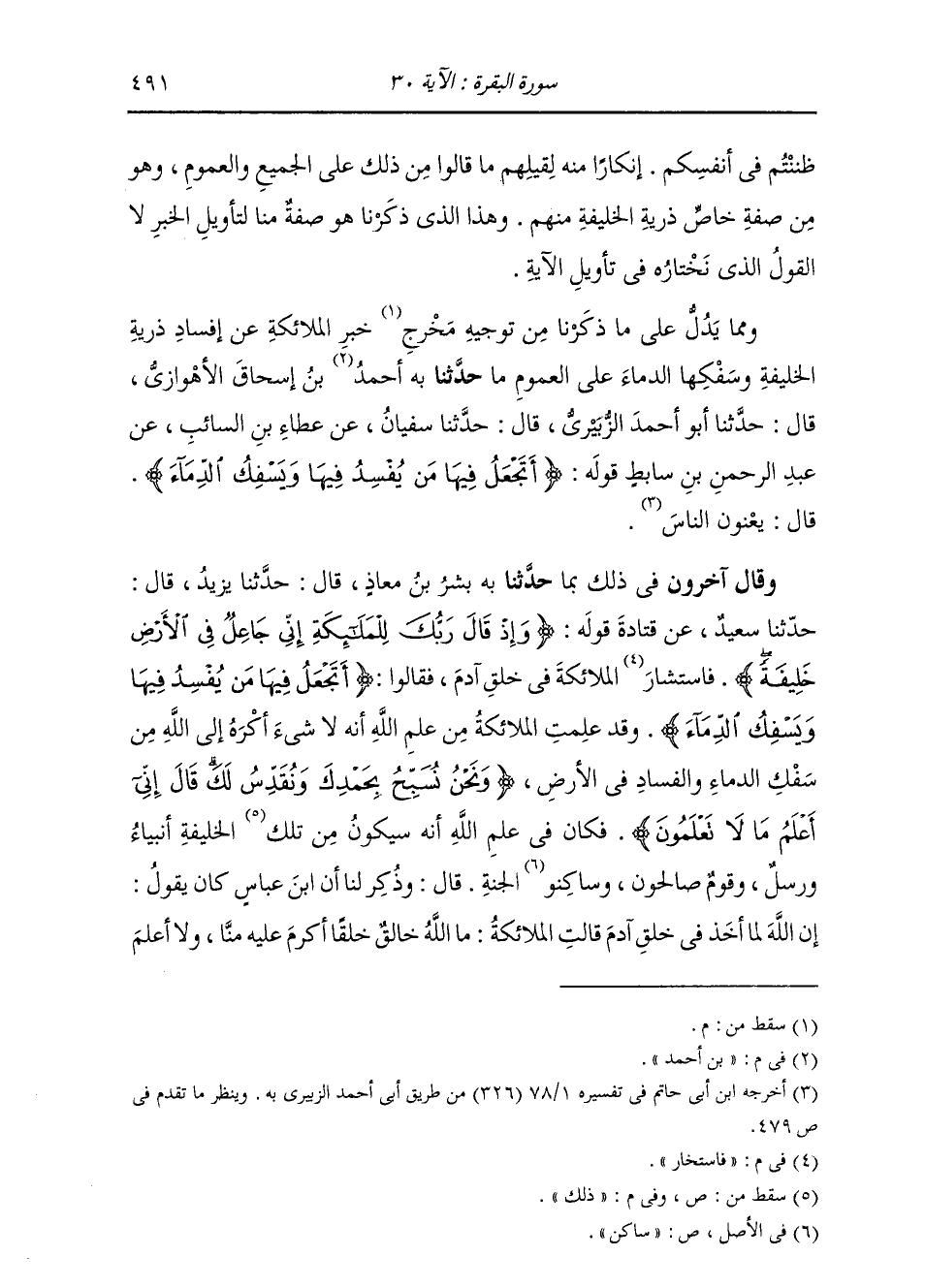 وَمِمَّا يَدُلُّ عَلَى مَا ذَكَرْنَا مِنْ تَوْجِيهِ خَبَرِ الْمَلَائِكَةِ عَنْ إِفْسَادِ ذُرِّيَّةِ الْخَلِيفَةِ وَسَفْكِهَا الدِّمَاءَ عَلَى الْعُمُومِ، مَا حَدَّثَنَا بِهِ، أَحْمَدُ بْنُ إِسْحَاقَ الْأَهْوَازِيُّ قَالَ: حَدَّثَنَا أَبُو أَحْمَدَ الزُّبَيْرِيُّ، قَالَ: حَدَّثَنَا سُفْيَانُ، عَنْ عَطَاءِ بْنِ السَّائِبِ، عَنْ عَبْدِ الرَّحْمَنِ بْنِ سَابِطٍ، قَوْلُهُ: " {§أَتَجْعَلُ فِيهَا مَنْ يُفْسِدُ فِيهَا وَيَسْفِكُ الدِّمَاءَ} [البقرة: 30] ، قَالَ: يَعْنُونَ النَّاسَ "