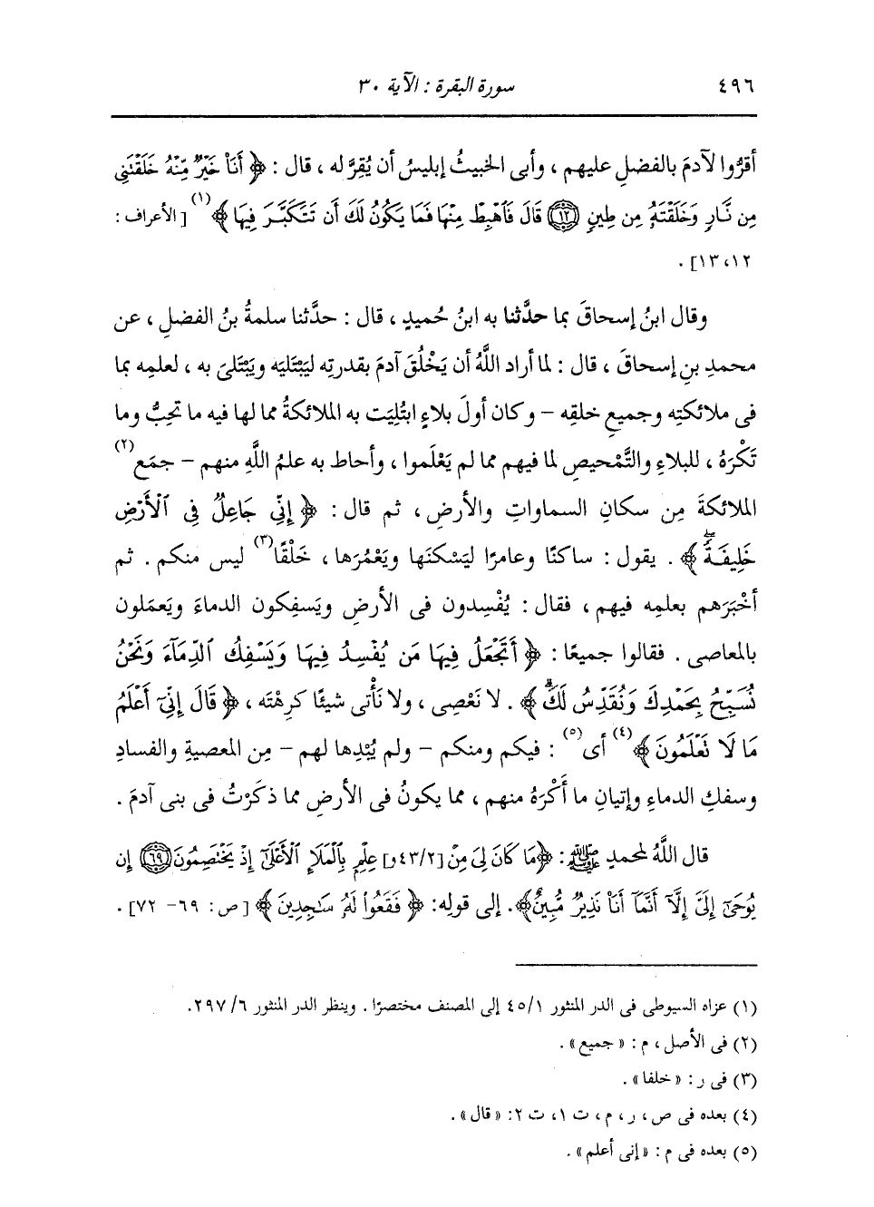 وَقَالَ ابْنُ إِسْحَاقَ بِمَا حَدَّثَنَا بِهِ ابْنُ حُمَيْدٍ، قَالَ: حَدَّثَنَا سَلَمَةُ بْنُ الْفَضْلِ، عَنْ مُحَمَّدِ بْنِ إِسْحَاقَ، قَالَ: " §لَمَّا أَرَادَ اللَّهُ أَنْ يَخْلُقَ آدَمَ بِقُدْرَتِهِ لِيَبْتَلِيَهُ وَيَبْتَلِيَ بِهِ لِعِلْمِهِ بِمَا فِي مَلَائِكَتِهِ وَجَمِيعِ خَلْقِهِ، وَكَانَ أَوَّلُ بَلَاءٍ ابْتُلِيَتْ بِهِ الْمَلَائِكَةُ مِمَّا لَهَا فِيهِ مَا تُحِبُّ وَمَا تَكْرَهُ لِلْبَلَاءِ وَالتَّمْحِيصِ لِمَا فِيهِمْ مِمَّا لَمْ يَعْلَمُوا وَأَحَاطَ بِهِ عِلْمُ اللَّهِ مِنْهُمْ، جَمَعَ الْمَلَائِكَةَ مِنْ سُكَّانِ السَّمَوَاتِ وَالْأَرْضِ، ثُمَّ قَالَ: {إِنِّي جَاعِلٌ فِي الْأَرْضِ خَلِيفَةً} [البقرة: 30] يَقُولُ: عَامِرٌ أَوْ سَاكِنٌ يَسْكُنُهَا وَيَعْمُرُهَا خَلْقًا لَيْسَ مِنْكُمْ. ثُمَّ أَخْبَرَهُمْ بِعِلْمِهِ فِيهِمْ، فَقَالَ: يُفْسِدُونَ فِي الْأَرْضِ وَيَسْفِكُونَ الدِّمَاءَ وَيَعْمَلُونَ بِالْمَعَاصِي، فَقَالُوا جَمِيعًا: {أَتَجْعَلُ فِيهَا مَنْ يُفْسِدُ فِيهَا وَيَسْفِكُ الدِّمَاءَ وَنَحْنُ نُسَبِّحُ بِحَمْدِكَ وَنُقَدِّسُ لَكَ} [البقرة: 30] لَا نَعْصِيَ وَلَا نَأْتِي شَيْئًا كَرِهْتَهُ؟ قَالَ: {إِنِّي أَعْلَمُ مَا لَا تَعْلَمُونَ} [البقرة: 30] قَالَ: إِنِّي أَعْلَمُ فِيكُمْ وَمِنْكُمْ، وَلَمْ يُبْدِهَا لَهُمْ، مِنَ الْمَعْصِيَةِ وَالْفَسَادِ وَسَفْكِ الدِّمَاءِ وَإِتْيَانِ مَا أَكْرَهُ مِنْهُمْ، مِمَّا يَكُونُ فِي الْأَرْضِ، مِمَّا ذَكَرْتُ فِي بَنِي آدَمَ. قَالَ اللَّهُ لِمُحَمَّدٍ صَلَّى اللهُ عَلَيْهِ وَسَلَّمَ: {مَا كَانَ لِيَ مِنْ عِلْمٍ بِالْمَلَإِ الْأَعْلَى إِذْ يَخْتَصِمُونَ إِنْ يُوحَى إِلَيَّ إِلَّا أَنَّمَا أَنَا نَذِيرٌ مُبِينٌ} [ص: 70] إِلَى قَوْلِهِ: {فَقَعُوا لَهُ سَاجِدِينَ} [الحجر: 29]-[497]- فَذَكَرَ لِنَبِيِّهِ صَلَّى اللهُ عَلَيْهِ وَسَلَّمَ الَّذِي كَانَ مِنْ ذِكْرِهِ آدَمَ حِينَ أَرَادَ خَلْقَهُ وَمُرَاجَعَةَ الْمَلَائِكَةِ إِيَّاهُ فِيمَا ذَكَرَ لَهُمْ مِنْهُ. فَلَمَّا عَزَمَ اللَّهُ تَعَالَى ذِكْرُهُ عَلَى خَلْقِ آدَمَ قَالَ لِلْمَلَائِكَةِ: {إِنِّي خَالِقٌ بَشَرًا مِنْ صَلْصَالٍ مِنْ حَمَأٍ مَسْنُونٍ} بِيَدَيَّ تَكْرِمَةً لَهُ، وَتَعْظِيمًا لِأَمْرِهِ، وَتَشْرِيفًا لَهُ؛ حَفِظَتِ الْمَلَائِكَةُ عَهْدَهُ، وَوَعُوا قَوْلَهُ، وَأَجْمَعُوا الطَّاعَةَ، إِلَّا مَا كَانَ مِنْ عَدُوِّ اللَّهِ إِبْلِيسُ، فَإِنَّهُ صَمَتَ عَلَى مَا كَانَ فِي نَفْسِهِ مِنَ الْحَسَدِ وَالْبَغْيِ وَالتَّكَبُّرِ وَالْمَعْصِيَةِ. وَخَلَقَ اللَّهُ آدَمَ مِنْ آدَمَةِ الْأَرْضِ، مِنْ طِينٍ لَازِبٍ مِنْ حَمَأٍ مَسْنُونٍ، بِيَدَيْهِ تَكْرِمَةً لَهُ وَتَعْظِيمًا لِأَمْرِهِ وَتَشْرِيفًا لَهُ عَلَى سَائِرِ خَلْقِهِ. قَالَ ابْنُ إِسْحَاقَ: فَيُقَالُ وَاللَّهُ أَعْلَمُ: خَلَقَ اللَّهُ آدَمَ ثُمَّ وَضَعَهُ يَنْظُرُ إِلَيْهِ أَرْبَعِينَ عَامًا قَبْلَ أَنْ يَنْفُخَ فِيهِ الرُّوحَ حَتَّى عَادَ صَلْصَالًا كَالْفَخَّارِ، وَلَمْ تَمَسَّهُ نَارٌ. قَالَ: فَيُقَالُ وَاللَّهُ أَعْلَمُ: إِنَّهُ لَمَّا انْتَهَى الرُّوحُ إِلَى رَأْسِهِ عَطَسَ، فَقَالَ: الْحَمْدُ لِلَّهِ. فَقَالَ لَهُ رَبُّهُ: يَرْحَمُكَ رَبُّكَ. وَوَقَعَ الْمَلَائِكَةُ حِينَ اسْتَوَى سُجُودًا لَهُ حِفْظًا لِعَهْدِ اللَّهِ الَّذِي عَهِدَ إِلَيْهِمْ، وَطَاعَةً لِأَمْرِهِ الَّذِي أَمَرَهُمْ بِهِ. وَقَامَ عَدُوُّ اللَّهِ إِبْلِيسُ مِنْ بَيْنِهِمْ، فَلَمْ يَسْجُدْ مُكَابِرًا مُتَعَظِّمًا بَغْيًا وَحَسَدًا، فَقَالَ لَهُ: {يَا إِبْلِيسُ مَا مَنَعَكَ أَنْ تَسْجُدَ لِمَا خَلَقْتُ بِيَدَيَّ} [ص: 75] إِلَى: {لَأَمْلَأَنَّ جَهَنَّمَ مِنْكَ وَمِمَّنْ تَبِعَكَ مِنْهُمْ أَجْمَعِينَ} [ص: 85] قَالَ: فَلَمَّا فَرَغَ اللَّهُ مِنْ إِبْلِ
