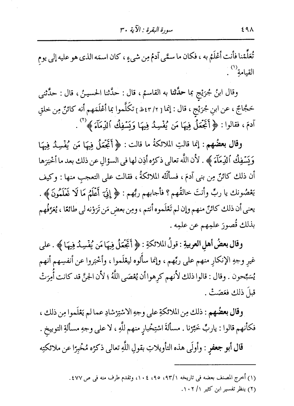 وَقَالَ ابْنُ جُرَيْجٍ بِمَا حَدَّثَنَا بِهِ الْقَاسِمُ، قَالَ: حَدَّثَنَا الْحُسَيْنُ، قَالَ: حَدَّثَنِي حَجَّاجٌ، عَنِ ابْنِ جُرَيْجٍ، قَالَ: " §إِنَّمَا تَكَلَّمُوا بِمَا أَعْلَمَهُمْ أَنَّهُ كَائِنٌ مِنْ خَلْقِ آدَمَ، فَقَالُوا: {أَتَجْعَلُ فِيهَا مَنْ يُفْسِدُ فِيهَا وَيَسْفِكُ الدِّمَاءَ} [البقرة: 30] " وَقَالَ بَعْضُهُمْ: إِنَّمَا قَالَتِ الْمَلَائِكَةُ مَا قَالَتْ: {أَتَجْعَلُ فِيهَا مَنْ يُفْسِدُ فِيهَا وَيَسْفِكُ الدِّمَاءَ} [البقرة: 30] لِأَنَّ اللَّهَ أَذِنَ لَهَا فِي السُّؤَالِ عَنْ ذَلِكَ بَعْدَ مَا أَخْبَرَهَا أَنَّ ذَلِكَ كَائِنٌ مِنْ بَنِي آدَمَ، فَسَأَلَتْهُ الْمَلَائِكَةُ فَقَالَتْ عَلَى التَّعَجُّبِ مِنْهَا: وَكَيْفَ يَعْصُونَكَ يَا رَبِّ وَأَنْتَ خَالِقُهُمْ. فَأَجَابَهُمْ رَبُّهُمْ: {إِنِّي أَعْلَمُ مَا لَا تَعْلَمُونَ} [البقرة: 30] يَعْنِي أَنَّ ذَلِكَ كَائِنٌ مِنْهُمْ وَإِنْ لَمْ تَعْلَمُوهُ أَنْتُمْ، وَمِنْ بَعْضِ مَنْ تَرَوْنَهُ لِي طَائِعًا. يُعَرِّفُهُمْ بِذَلِكَ قُصُورَ عِلْمِهِمْ عَنْ عِلْمِهِ. وَقَالَ بَعْضُ أَهْلِ الْعَرَبِيَّةِ: قَوْلُ الْمَلَائِكَةِ: {أَتَجْعَلُ فِيهَا مَنْ يُفْسِدُ فِيهَا} [البقرة: 30] عَلَى غَيْرِ وَجْهِ الْإِنْكَارِ مِنْهُمْ عَلَى رَبِّهِمْ، وَإِنَّمَا سَأَلُوهُ لِيَعْلَمُوا، وَأَخْبَرُوا عَنْ أَنْفُسِهِمْ أَنَّهُمْ يُسَبِّحُونَ. وَقَالَ: قَالُوا ذَلِكَ لِأَنَّهُمْ كَرِهُوا أَنْ يُعْصَى اللَّهُ، لِأَنَّ الْجِنَّ قَدْ كَانَتْ أُمِرَتْ قَبْلَ ذَلِكَ فَعَصَتْ. وَقَالَ بَعْضُهُمْ: ذَلِكَ مِنَ الْمَلَائِكَةِ عَلَى وَجْهِ الِاسْتِرْشَادِ عَمَّا لَمْ يَعْلَمُوا مِنْ ذَلِكَ، فَكَأَنَّهُمْ قَالُوا: يَا رَبِّ خَبِّرْنَا؛ مَسْأَلَةَ اسْتِخْبَارٍ مِنْهُمْ لِلَّهِ لَا عَلَى وَجْهِ مَسْأَلَةِ التَّوْبِيخِ. قَالَ أَبُو جَعْفَرٍ: وَأَوْلَى هَذِهِ التَّأْوِيلَاتِ بِقَوْلِ اللَّهِ جَلَّ ثَنَاؤُهُ مُخْبِرًا عَنْ مَلَائِكَتِهِ