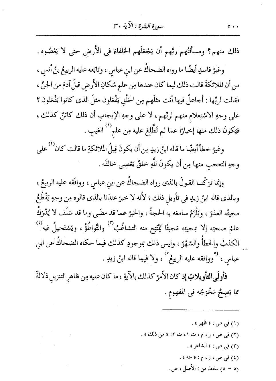 ذَلِكَ مِنْهُمْ؟ وَمَسْأَلَتُهُمْ رَبَّهُمْ أَنْ يَجْعَلَهُمُ الْخُلَفَاءُ فِي الْأَرْضِ حَتَّى لَا يَعْصُوهُ. وَغَيْرُ فَاسِدٍ أَيْضًا مَا رَوَاهُ الضَّحَّاكُ عَنِ ابْنِ عَبَّاسٍ وَتَابَعَهُ عَلَيْهِ الرَّبِيعُ بْنُ أَنَسٍ مِنْ أَنَّ الْمَلَائِكَةَ قَالَتْ ذَلِكَ لِمَا كَانَ عِنْدَهَا مِنْ عِلْمِ سُكَّانِ الْأَرْضِ قَبْلَ آدَمَ مِنَ الْجِنِّ، فَقَالَتْ لِرَبِّهَا: أَجَاعِلٌ فِيهَا أَنْتَ مِثْلَهُمْ مِنَ الْخَلْقِ يَفْعَلُونَ مِثْلَ الَّذِي كَانُوا يَفْعَلُونَ؟ عَلَى وَجْهِ الِاسْتِعْلَامِ مِنْهُمْ لِرَبِّهِمْ، لَا عَلَى وَجْهِ الْإِيجَابِ أَنَّ ذَلِكَ كَائِنٌ كَذَلِكَ، فَيَكُونُ ذَلِكَ مِنْهَا إِخْبَارًا عَمَّا لَمْ تَطَّلِعْ عَلَيْهِ مِنْ عِلْمِ الْغَيْبِ. وَغَيْرُ خَطَأٍ أَيْضًا مَا قَالَهُ ابْنُ زَيْدٍ مِنْ أَنْ يَكُونَ قِيلُ الْمَلَائِكَةِ مَا قَالَتْ مِنْ ذَلِكَ عَلَى وَجْهِ التَّعَجُّبِ مِنْهَا مِنْ أَنْ يَكُونَ لِلَّهِ خَلْقٌ يَعْصِي خَالِقَهُ. وَإِنَّمَا تَرَكْنَا الْقَوْلَ بِالَّذِي رَوَاهُ الضَّحَّاكُ عَنِ ابْنِ عَبَّاسٍ وَوَافَقَهُ عَلَيْهِ الرَّبِيعُ بْنُ أَنَسٍ وَبِالَّذِي قَالَهُ ابْنُ زَيْدٍ فِي تَأْوِيلِ ذَلِكَ؛ لِأَنَّهُ لَا خَبَرَ عِنْدَنَا بِالَّذِي قَالُوهُ مِنْ وَجْهٍ يَقْطَعُ مَجِيئُهُ الْعُذْرَ وَيُلْزِمُ سَامِعَهُ بِهِ الْحُجَّةَ. وَالْخَبَرُ عَمَّا مَضَى وَمَا قَدْ سَلَفَ، لَا يُدْرَكُ عِلْمُ صِحَّتِهِ إِلَّا بَمِجِيئِهِ مَجِيئًا يَمْتَنِعُ مِنْهُ التَّشَاغُبُ وَالتَّوَاطُؤُ، وَيَسْتَحِيلُ مِنْهُ الْكَذِبُ وَالْخَطَأُ وَالسَّهْوُ. وَلَيْسَ ذَلِكَ بِمَوْجُودٍ كَذَلِكَ فِيمَا حَكَاهُ الضَّحَّاكُ عَنِ ابْنِ عَبَّاسٍ وَوَافَقَهُ عَلَيْهِ الرَّبِيعُ، وَلَا فِيمَا قَالَهُ ابْنُ زَيْدٍ. فَأَوْلَى التَّأْوِيلَاتِ إِذْ كَانَ الْأَمْرُ كَذَلِكَ بِالْآيَةِ، مَا كَانَ عَلَيْهِ مِنْ ظَاهِرِ التَّنْزِيلِ دَلَالَةً مِمَّا يَصِحُّ مَخْرَجُهُ فِي الْمَفْهُومِ.